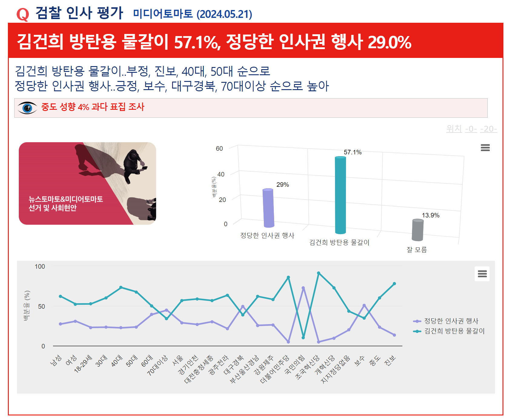Á¶»ç±â°ü ¹Ìµð¾îÅ丶Åä°¡ 5¿ù 18ÀÏ¿¡¼ 19ÀϱîÁö ÀÌÆ²°£ ½Ç½ÃÇÏ¿© 21ÀÏ ¹ßÇ¥ÇÑ ¡¸°ËÂû ÀÎ»ç Æò°¡¡¹¸¦ ¹¯´Â Á¶»ç¿¡¼ ¡¸±è°ÇÈñ ¹æÅº¿ë ¹°°¥ÀÌ¡¹ÀÌ 57.1%¸¦ ±â·ÏÇÏ¿© 2À§ ¡¸Á¤´çÇÑ Àλç±Ç Çà»ç¡¹(29%)¿¡ 28.1%p Â÷ÀÌ·Î ¾Õ¼ ³ª°¡´Â °ÍÀ¸·Î ³ªÅ¸³µ´Ù.