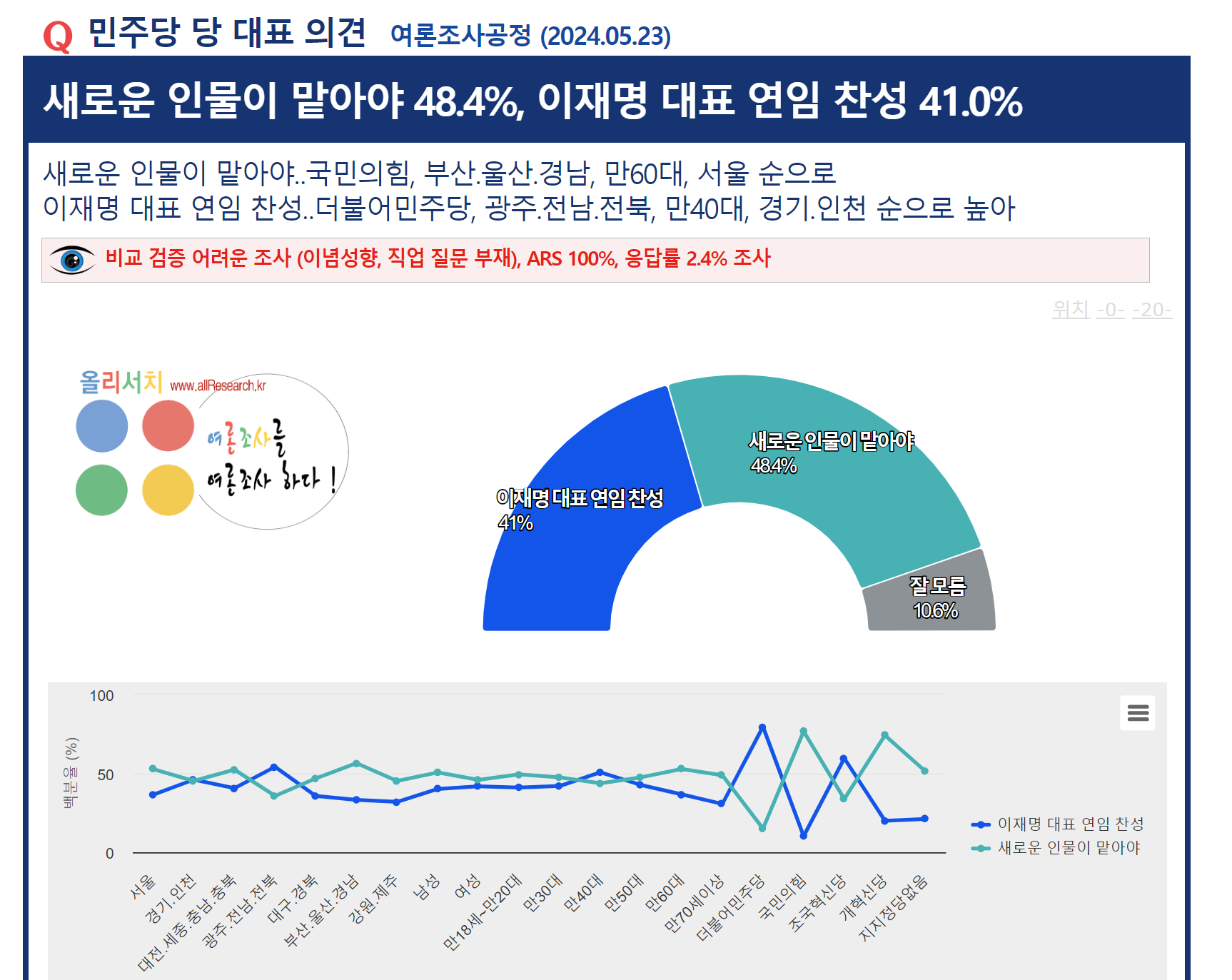¹ÎÁÖ´ç ´ç ´ëÇ¥ Àǰß(¿©·ÐÁ¶»ç°øÁ¤, ÀÀ´ä·ü 2.4%, 100% ARS Á¶»ç, 2024.05.23°øÇ¥)