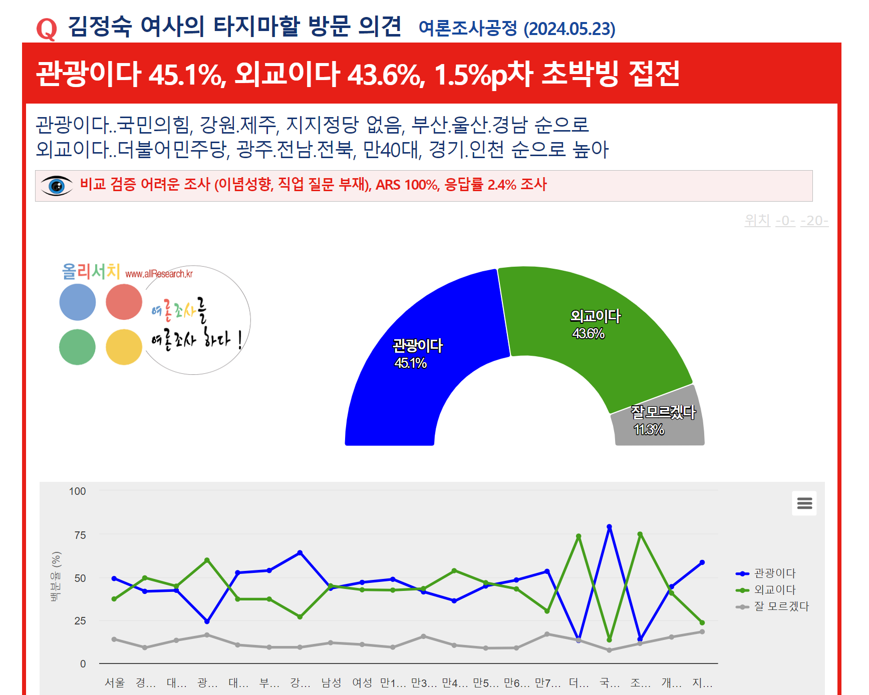 ±èÁ¤¼÷ ¿©»çÀÇ Å¸Áö¸¶ÇÒ ¹æ¹® Àǰß(¿©·ÐÁ¶»ç°øÁ¤, ÀÀ´ä·ü 2.4%, 100% ARS Á¶»ç, 2024.05.23°øÇ¥)
