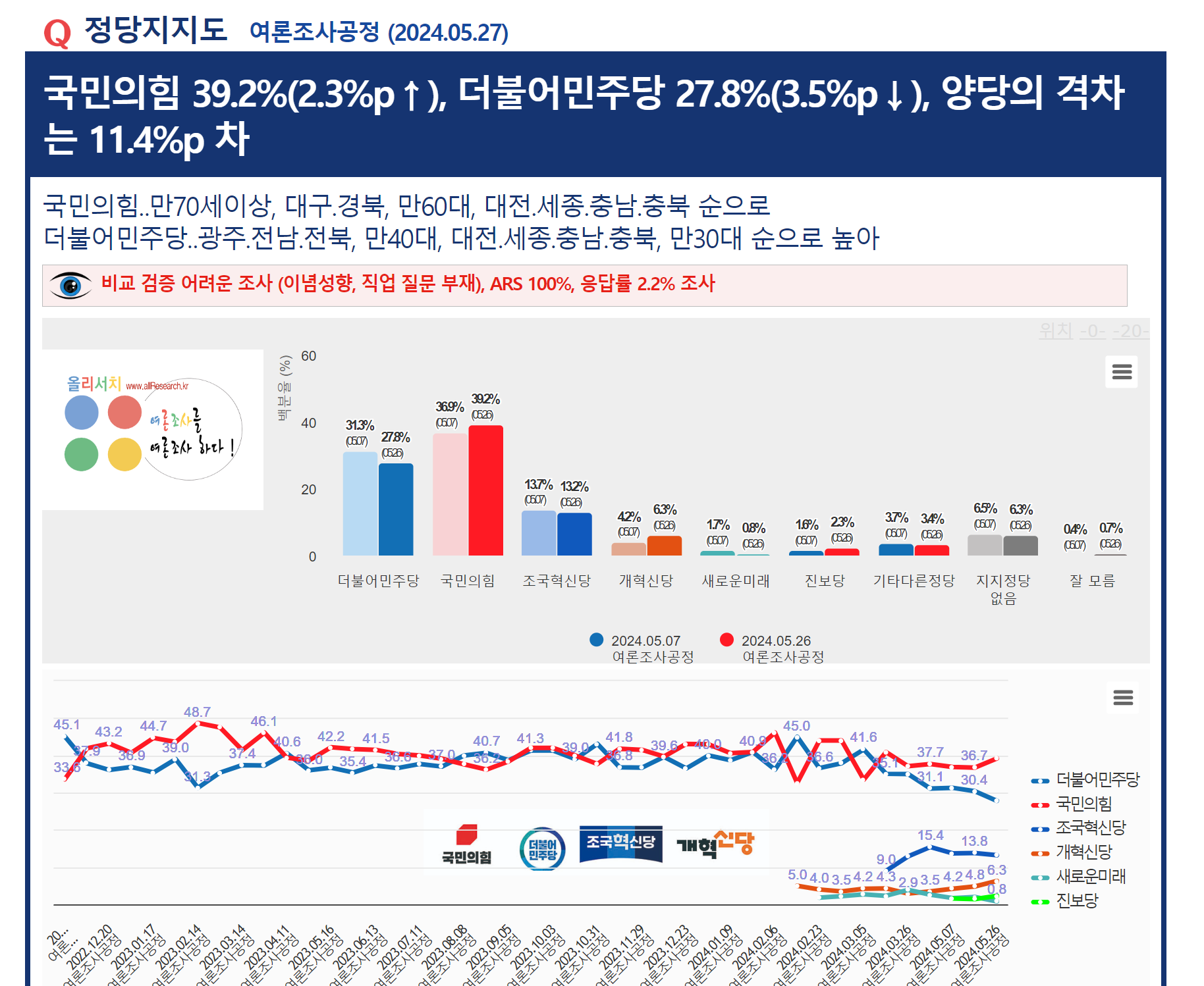 Á¤´çÁöÁöµµ(¿©·ÐÁ¶»ç°øÁ¤, ÀÀ´ä·ü 2.2%, 100% ARS Á¶»ç, 2024.05.27°øÇ¥)