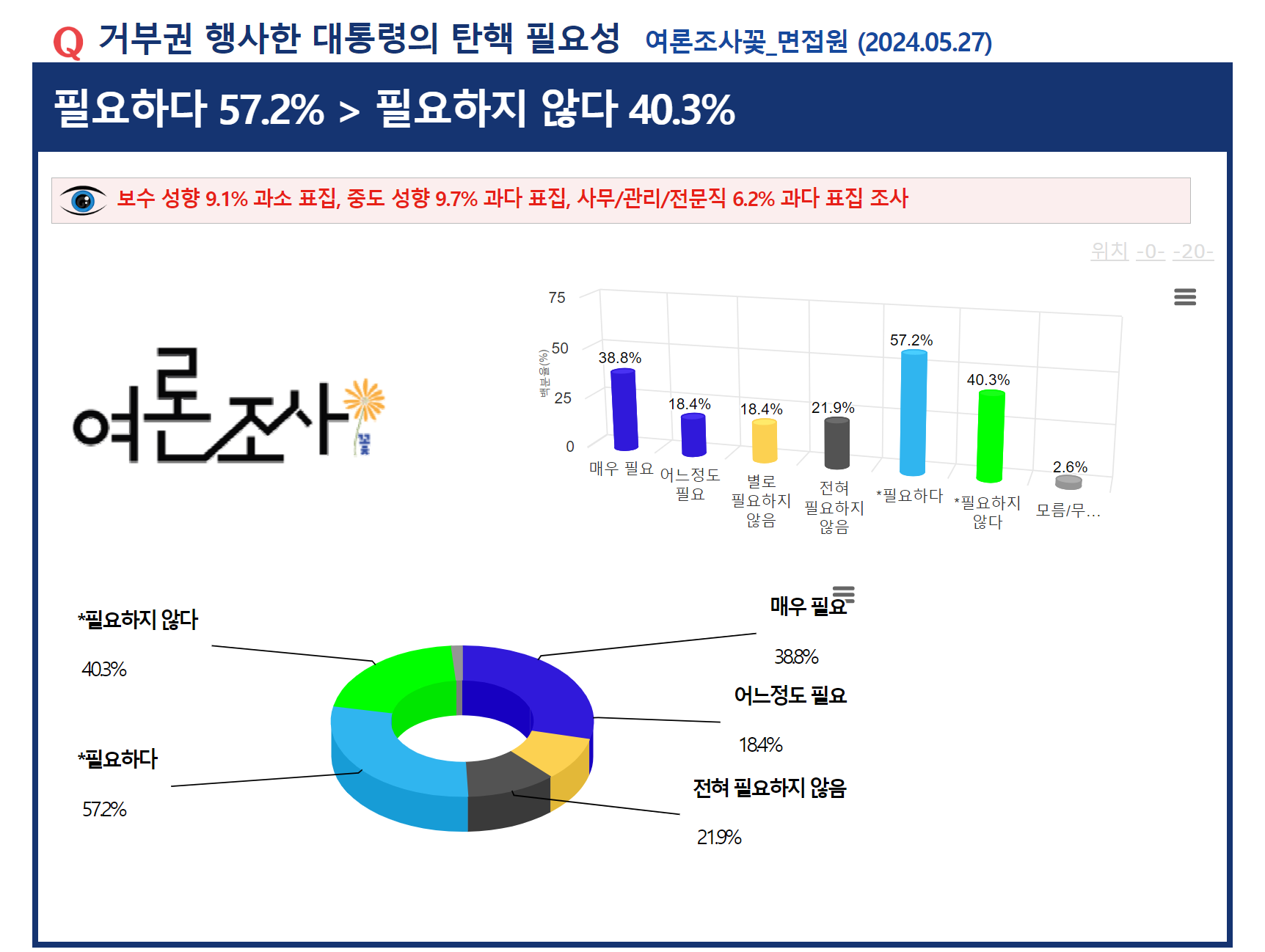 Á¶»ç±â°ü ¿©·ÐÁ¶»ç²ÉÀÌ 5¿ù 24ÀÏ¿¡¼ 25ÀϱîÁö ÀÌÆ²°£ ½Ç½ÃÇÏ¿© 27ÀÏ ¹ßÇ¥ÇÑ ¡¸°ÅºÎ±Ç Çà»çÇÑ ´ëÅë·ÉÀÇ ÅºÇÙ Çʿ伺¡¹Á¶»ç¿¡¼ '¸Å¿ì ÇÊ¿ä'¿Í '¾î´ÀÁ¤µµ ÇÊ¿ä'¸¦ ÇÕÇÑ ¡¸ÇÊ¿äÇÏ´Ù¡¹´Â 57.2%À̸ç, 'º°·Î ÇÊ¿äÇÏÁö ¾ÊÀ½'¿Í 'ÀüÇô ÇÊ¿äÇÏÁö ¾ÊÀ½'¸¦ ÇÕÇÑ ¡¸ÇÊ¿äÇÏÁö ¾Ê´Ù¡¹´Â 40.3%·Î ³ª¿Ô´Ù.