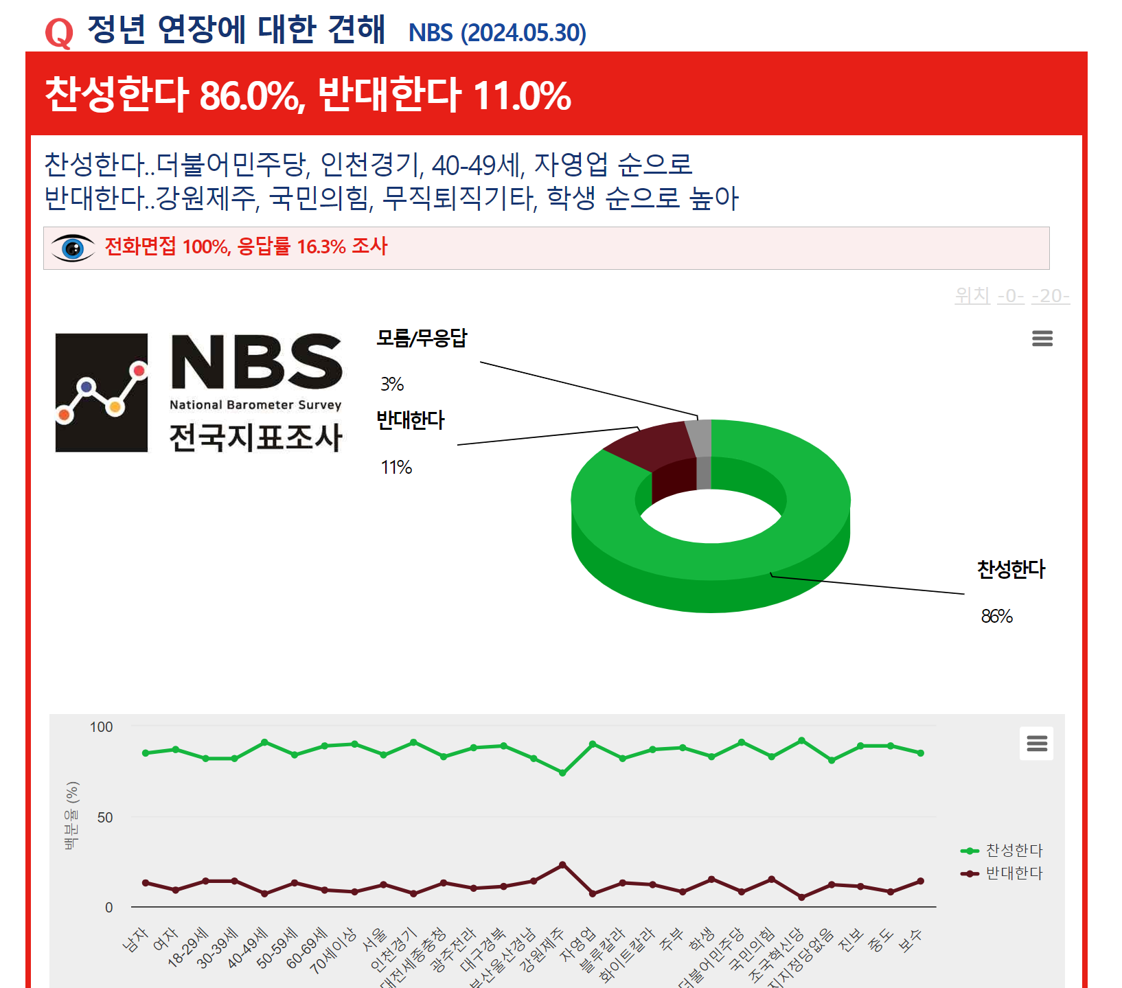 Á¶»ç±â°ü ÄÉÀ̽ºÅȸ®¼­Ä¡°¡ 5¿ù 27ÀÏ¿¡¼­ 29ÀϱîÁö »çÈê°£ ½Ç½ÃÇÏ¿© 30ÀÏ ¹ßÇ¥ÇÑ ¡¸Á¤³â ¿¬Àå¿¡ ´ëÇÑ °ßÇØ¡¹¸¦ ¹¯´Â Á¶»ç¿¡¼­ ¡¸Âù¼ºÇÑ´Ù¡¹°¡ 86%¸¦ ±â·ÏÇÏ¿© 2À§ ¡¸¹Ý´ëÇÑ´Ù¡¹(11%)¿¡ 75%p Â÷ÀÌ·Î ¾Õ¼­ ³ª°¡´Â °ÍÀ¸·Î ³ªÅ¸³µ´Ù.