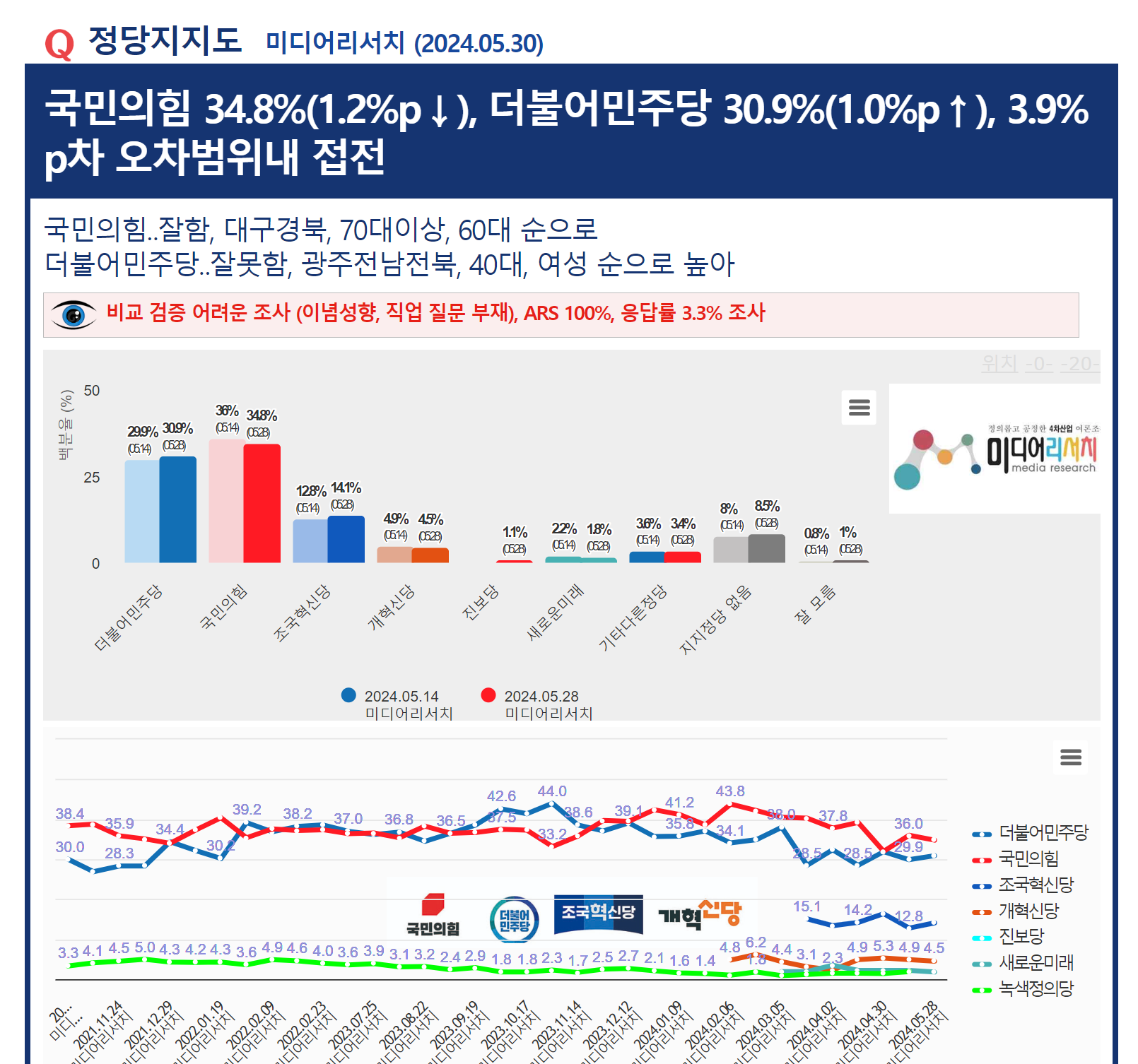 Á¤´çÁöÁöµµ(¹Ìµð¾î¸®¼­Ä¡, ÀÀ´ä·ü 3.3%, 100% ARS Á¶»ç, 2024.05.30°øÇ¥)