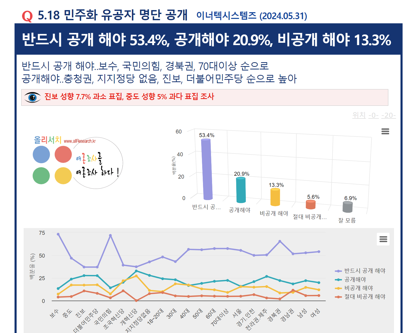 Á¶»ç±â°ü À̳ÊÅØ½Ã½ºÅÛÁî°¡ 5¿ù 27ÀÏ¿¡¼ 28ÀϱîÁö ÀÌÆ²°£ ½Ç½ÃÇÏ¿© 31ÀÏ ¹ßÇ¥ÇÑ ¡¸5.18 ¹ÎÁÖÈ À¯°øÀÚ ¸í´Ü °ø°³¡¹¸¦ ¹¯´Â Á¶»ç¿¡¼ ¡¸¹Ýµå½Ã °ø°³ ÇØ¾ß¡¹ÀÌ 53.4%¸¦ ±â·ÏÇÏ¿© 2À§ ¡¸°ø°³Çؾߡ¹(20.9%)¿¡ 32.5%p Â÷ÀÌ·Î ¾Õ¼ ³ª°¡¸ç, µÚ¸¦ ÀÌ¾î ¡¸ºñ°ø°³ ÇØ¾ß¡¹ÀÌ 13.3%, ¡¸Àý´ë ºñ°ø°³ ÇØ¾ß¡¹ÀÌ 5.6%¸¦ ±â·ÏÇÏ¿´´Ù.