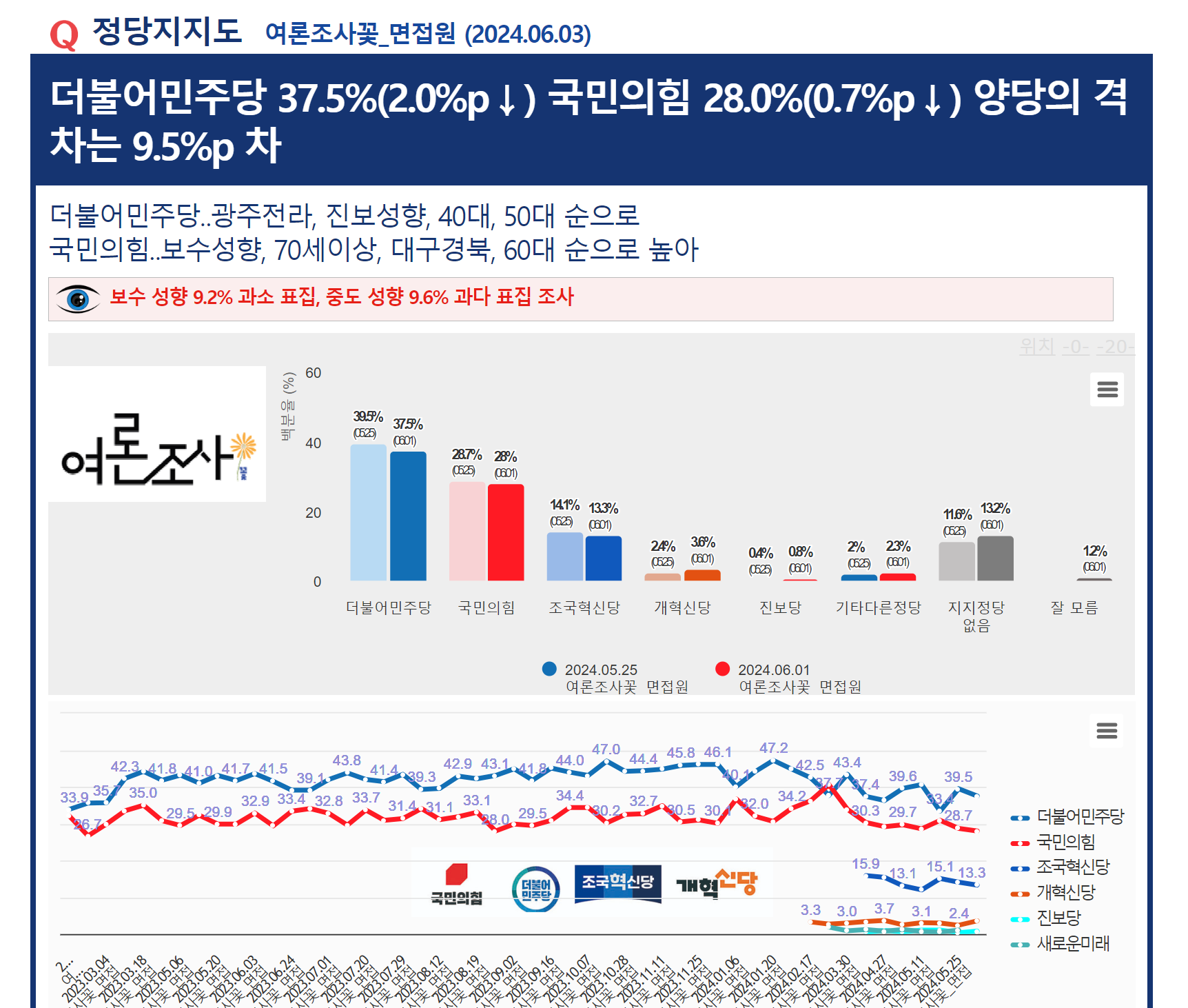 À̹ø Á¶»ç´Â Á÷Àü Á¶»ç(2024.05.27,¿©·ÐÁ¶»ç²É_¸éÁ¢¿ø)¿Í´Â ´Þ¸® ÁöÁöÀ²ÀÇ º¯È¸¦ º¸¿©ÁÖ°í ÀÖ´Ù.¡¸°³Çõ½Å´ç¡¹ÀÌ(°¡) Á÷Àü Á¶»ç ´ëºñ 1.2%p(2.4%¡æ3.6%) »ó½ÂÇÏ¿© »ó½ÂÆøÀÌ °¡Àå ÄÇÀ¸¸ç, ¹Ý´ë·Î ¡¸´õºÒ¾î¹ÎÁִ硹´Â Á÷Àü Á¶»ç ´ëºñ 2.0%p(39.5%¡æ37.5%) Ç϶ôÇÏ¿© °¡Àå Å« Ç϶ô¼¼¸¦ º¸¿´´Ù.