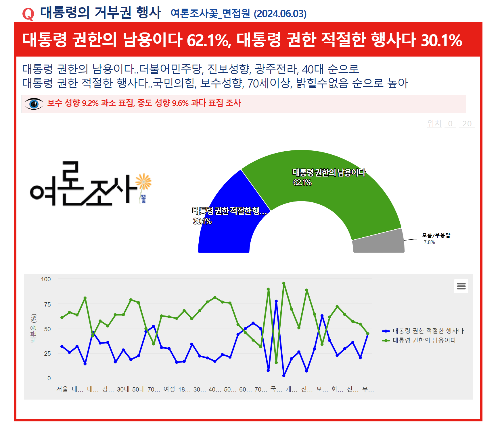 ¡¸´ëÅë·É ±ÇÇÑÀÇ ³²¿ëÀÌ´Ù¡¹´Â "´õºÒ¾î¹ÎÁÖ´ç"ÁöÁöÃþ(89.7%) "Áøº¸¼ºÇâ"¼ºÇâ(88.7%) "±¤ÁÖÀü¶ó"Áö¿ª(80.7%) "40´ë"¿¬·ÉÃþ(78.9%)¿¡¼ ³ô¾Ò°í, ¡¸´ëÅë·É ±ÇÇÑ ÀûÀýÇÑ Çà»ç´Ù¡¹´Â "±¹¹ÎÀÇÈû"ÁöÁöÃþ(77.5%) "º¸¼ö¼ºÇâ"¼ºÇâ(62.7%) "70¼¼ÀÌ»ó"¿¬·ÉÃþ(52%) "¹àÈú¼ö¾øÀ½"Á÷¾÷±º(49%)¿¡¼ »ó´ëÀûÀ¸·Î ³ôÀº °æÀï·ÂÀ» º¸¿´´Ù.