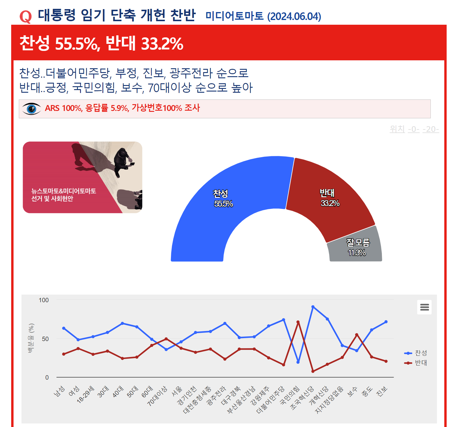 Á¶»ç±â°ü ¹Ìµð¾îÅ丶Åä°¡ 6¿ù 1ÀÏ¿¡¼ 2ÀϱîÁö ÀÌÆ²°£ ½Ç½ÃÇÏ¿© 4ÀÏ ¹ßÇ¥ÇÑ ¡¸´ëÅë·É Àӱ⠴ÜÃà °³Çå Âù¹Ý¡¹¸¦ ¹¯´Â Á¶»ç¿¡¼ ¡¸Âù¼º¡¹ÀÌ 55.5%¸¦ ±â·ÏÇÏ¿© 2À§ ¡¸¹Ý´ë¡¹(33.2%)¿¡ 22.3%p Â÷ÀÌ·Î ¾Õ¼ ³ª°¡´Â °ÍÀ¸·Î ³ªÅ¸³µ´Ù.