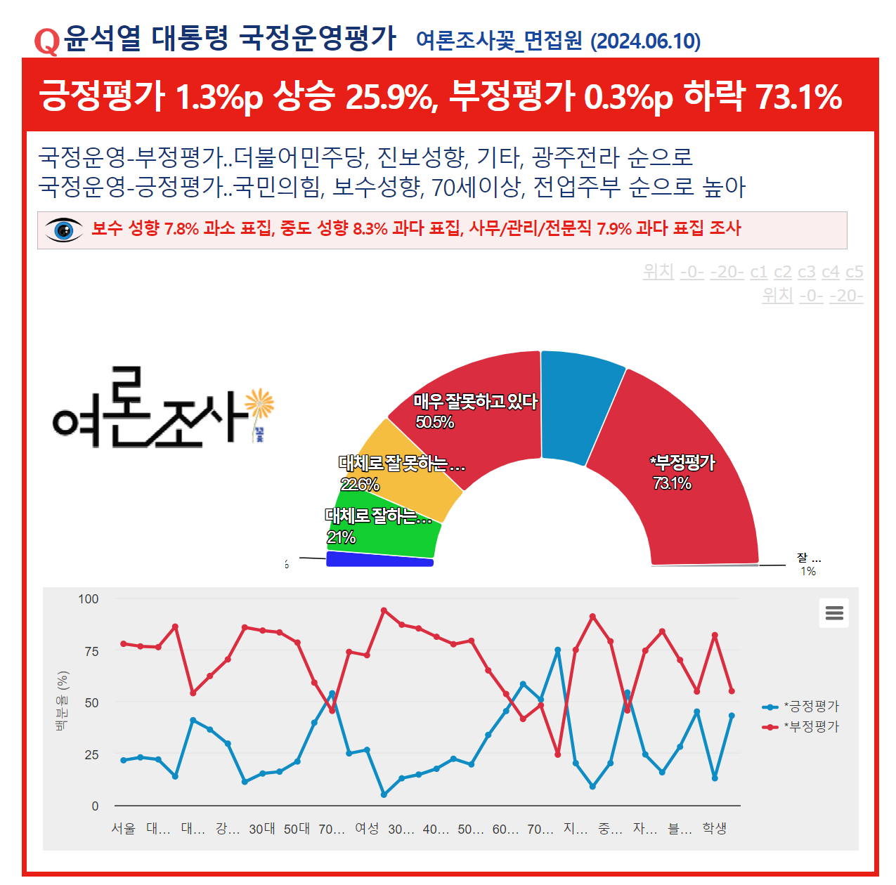 À̹ø Á¶»ç´Â Á÷Àü Á¶»ç(2024.06.03,¿©·ÐÁ¶»ç²É_¸éÁ¢¿ø)¿Í´Â ´Þ¸® ÁöÁöÀ²ÀÇ º¯È­¸¦ º¸¿©ÁÖ°í ÀÖ´Ù.¡¸¸Å¿ì À߸øÇϰí ÀÖ´Ù¡¹ÀÌ(°¡) Á÷Àü Á¶»ç ´ëºñ 1.9%p(48.6%¡æ50.5%) »ó½ÂÇÏ¿© »ó½ÂÆøÀÌ °¡Àå ÄÇÀ¸¸ç, ÀÌ¾î ¡¸±àÁ¤Æò°¡¡¹´Â 1.3%p(24.6%¡æ25.9%) »ó½Â, ¡¸´ëü·Î Àß ¸øÇÏ´Â ÆíÀÌ´Ù¡¹´Â 2.2%p(24.8%¡æ22.6%) Ç϶ôÀ¸·Î ³ª¿Ô´Ù.