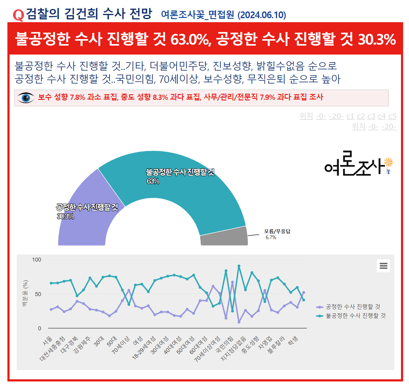 Á¶»ç±â°ü ¿©·ÐÁ¶»ç²ÉÀÌ 6¿ù 7ÀÏ¿¡¼­ 8ÀϱîÁö ÀÌÆ²°£ ½Ç½ÃÇÏ¿© 10ÀÏ ¹ßÇ¥ÇÑ ¡¸°ËÂûÀÇ ±è°ÇÈñ ¼ö»ç Àü¸Á¡¹¸¦ ¹¯´Â Á¶»ç¿¡¼­ ¡¸ºÒ°øÁ¤ÇÑ ¼ö»ç ÁøÇàÇÒ °Í¡¹ÀÌ 63%¸¦ ±â·ÏÇÏ¿© 2À§ ¡¸°øÁ¤ÇÑ ¼ö»ç ÁøÇàÇÒ °Í¡¹(30.3%)¿¡ 32.7%p Â÷ÀÌ·Î ¾Õ¼­ ³ª°¡´Â °ÍÀ¸·Î ³ªÅ¸³µ´Ù.