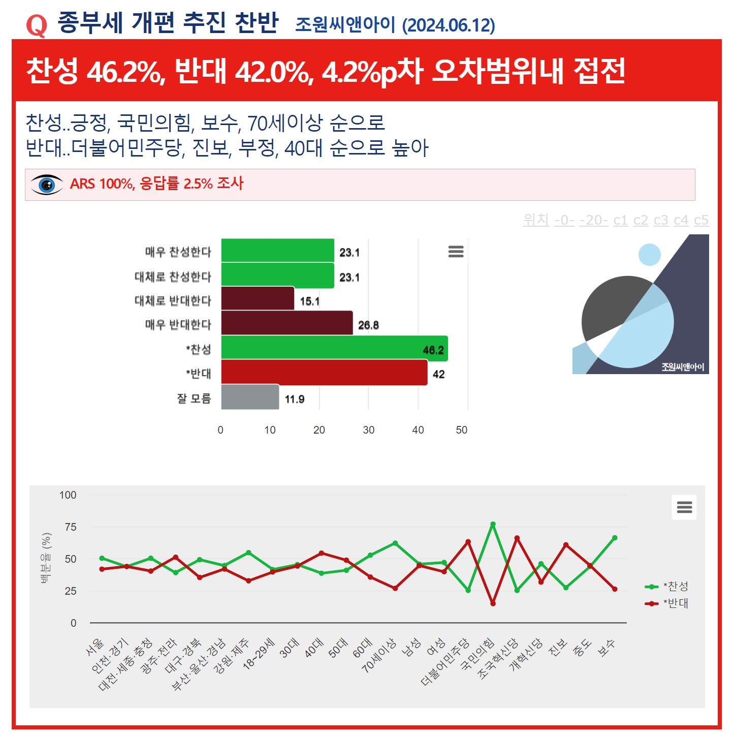 Á¶»ç±â°ü Á¶¿ø¾¾¾Ø¾ÆÀ̰¡ 6¿ù 9ÀÏ¿¡¼ 10ÀϱîÁö ÀÌÆ²°£ ½Ç½ÃÇÏ¿© 12ÀÏ ¹ßÇ¥ÇÑ ¡¸Á¾ºÎ¼¼ °³Æí ÃßÁø Âù¹Ý¡¹Á¶»ç¿¡¼ '¸Å¿ì Âù¼ºÇÑ´Ù'¿Í '´ëü·Î Âù¼ºÇÑ´Ù'¸¦ ÇÕÇÑ ¡¸Âù¼º¡¹Àº 46.2%À̸ç, '´ëü·Î ¹Ý´ëÇÑ´Ù'¿Í '¸Å¿ì ¹Ý´ëÇÑ´Ù'¸¦ ÇÕÇÑ ¡¸¹Ý´ë¡¹´Â 41.9%·Î ³ª¿Ô´Ù.