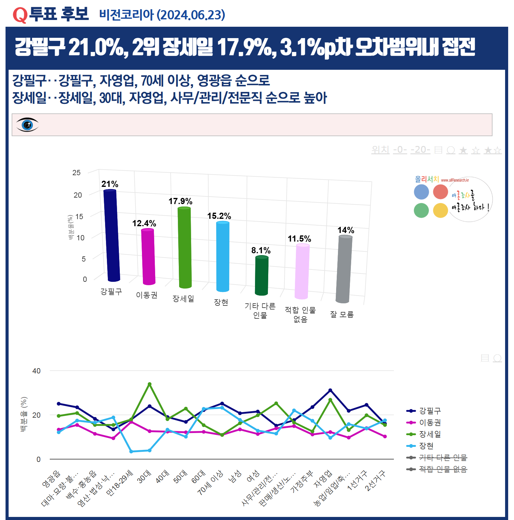 ¡¸°Çʱ¸¡¹È帴 "¿µ±¤À¾" Áö¿ª, "1¼±°Å±¸" ÀÀ´äÃþ, "ÀÚ¿µ¾÷" Á÷¾÷±º, "Çлý" Á÷¾÷±º, "Âù¼ºÇÑ´Ù" ÀÀ´äÃþ ÀÀ´äÃþ¿¡¼ 2À§ Àå¼¼ÀÏ Èĺ¸º¸´Ù 5.5%p, 4.7%p, 4.3%p, 7.2%p, 5.6%p °¢°¢ ³ô¾ÒÀ¸¸ç, "°¡Á¤ÁÖºÎ" Á÷¾÷±º, "³ó¾÷/ÀÓ¾÷/Ãà»ê¾÷/¾î¾÷" Á÷¾÷±º, "¹«Á÷/ÀºÅð/±âŸ" Á÷¾÷±º¿¡¼ 2À§ ¡¸ÀåÇö¡¹Èĺ¸º¸´Ù 6.2%p, 6%p, 4%p °¢°¢ ³ô¾Ò´Ù.
