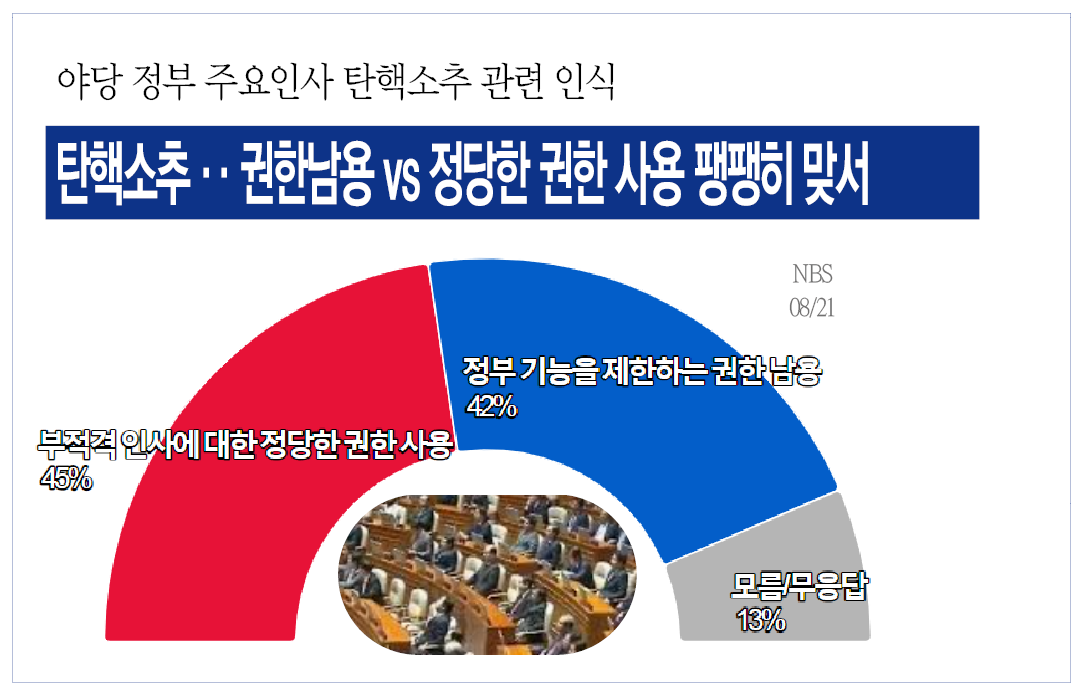 Á¶»ç±â°ü ¿¥ºê·¹ÀÎÆÛºí¸¯ÀÌ 8¿ù 19ÀÏ¿¡¼ 21ÀϱîÁö »çÈê°£ ½Ç½ÃÇÏ¿© 22ÀÏ ¹ßÇ¥ÇÑ ¡¸¾ß´ç Á¤ºÎ ÁÖ¿äÀλç źÇÙ¼ÒÃß °ü·Ã Àνġ¹¸¦ ¹¯´Â Á¶»ç¿¡¼ ¡¸ºÎÀû°Ý Àλ翡 ´ëÇÑ Á¤´çÇÑ ±ÇÇÑ »ç¿ë¡¹ÀÌ 45%¸¦ ±â·ÏÇÏ¿© 2À§ ¡¸Á¤ºÎ ±â´ÉÀ» Á¦ÇÑÇÏ´Â ±ÇÇÑ ³²¿ë¡¹(42%)¿¡ 3%p Â÷ÀÌ·Î ¾Õ¼ ³ª°¡´Â °ÍÀ¸·Î ³ªÅ¸³µ´Ù.