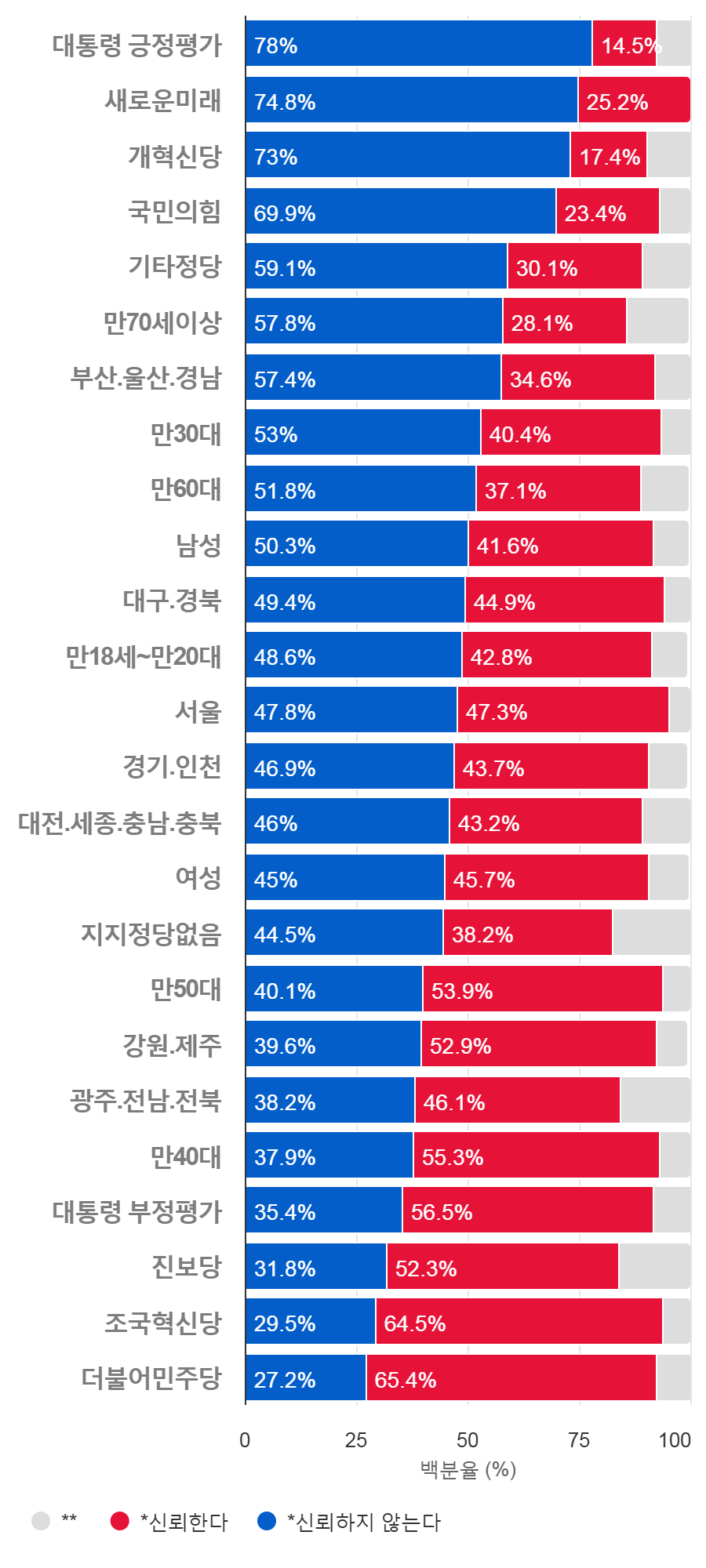 ¡¸½Å·ÚÇÏÁö ¾Ê´Â´Ù¡¹´Â "±¹¹ÎÀÇÈû"ÁöÁöÃþ(69.9%) "¸¸70¼¼ÀÌ»ó"¿¬·ÉÃþ(57.8%) "ºÎ»ê.¿ï»ê.°æ³²"Áö¿ª(57.4%) "¸¸30´ë"¿¬·ÉÃþ(53%)¿¡¼­ ³ô¾Ò°í, ¡¸½Å·ÚÇÑ´Ù¡¹´Â "´õºÒ¾î¹ÎÁÖ´ç"ÁöÁöÃþ(65.4%) "¸¸40´ë"¿¬·ÉÃþ(55.3%) "¸¸50´ë"¿¬·ÉÃþ(53.9%) "°­¿ø.Á¦ÁÖ"Áö¿ª(52.9%)¿¡¼­ »ó´ëÀûÀ¸·Î ³ôÀº °æÀï·ÂÀ» º¸¿´´Ù.