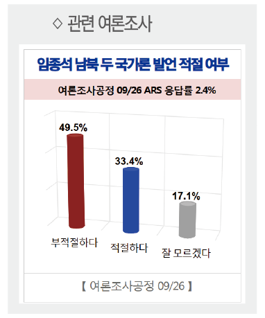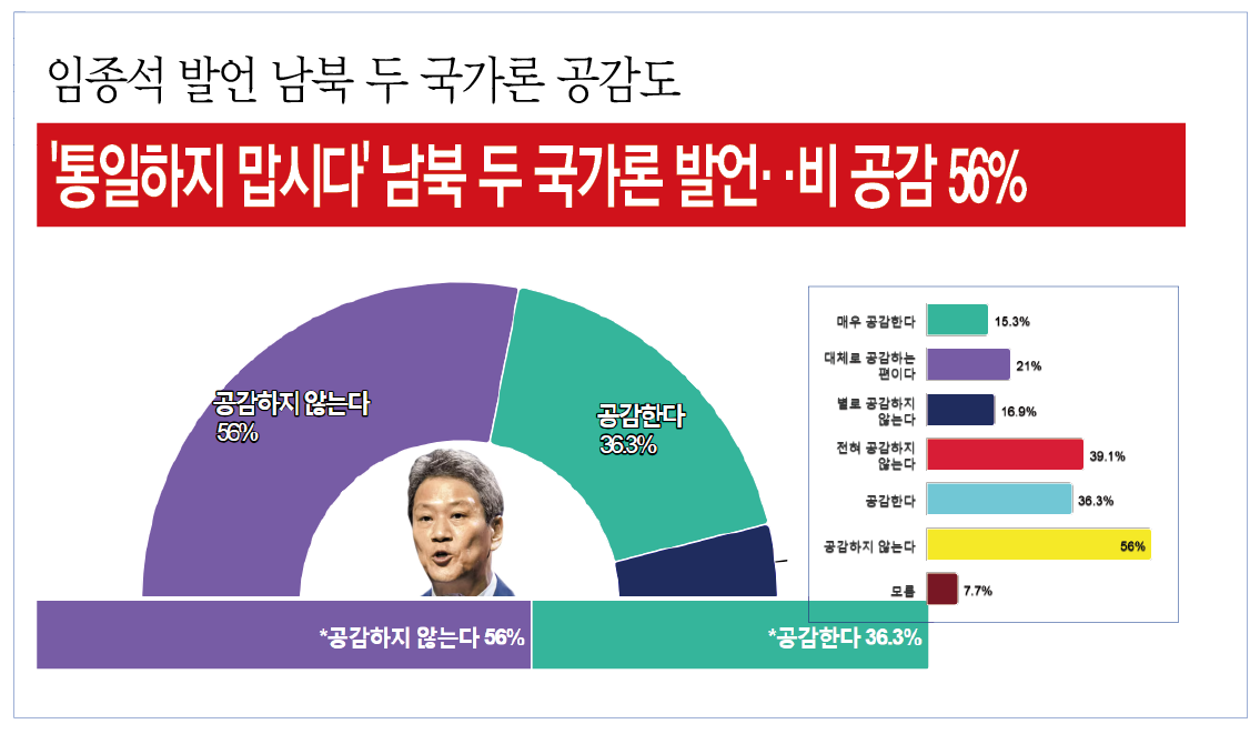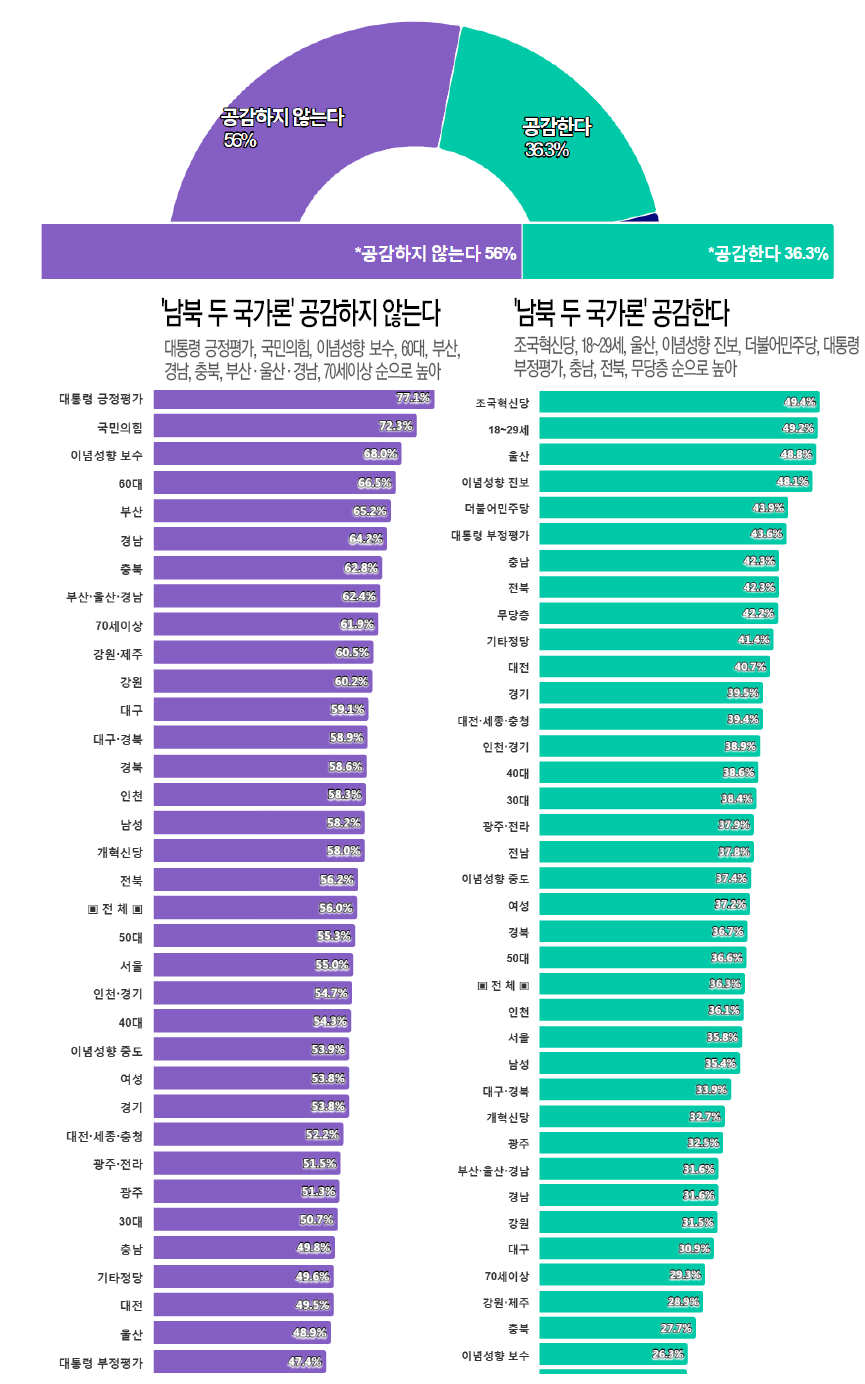 Á¶»ç±â°ü Á¶¿ø¾¾¾Ø¾ÆÀ̰¡ 9¿ù 28ÀÏ¿¡¼­ 30ÀϱîÁö »çÈê°£ ½Ç½ÃÇÏ¿© 2ÀÏ ¹ßÇ¥ÇÑ ¡¸³²ºÏ µÎ ±¹°¡·Ð °ø°¨µµ¡¹Á¶»ç¿¡¼­ '¸Å¿ì °ø°¨ÇÑ´Ù'¿Í '´ëü·Î °ø°¨ÇÏ´Â ÆíÀÌ´Ù'¸¦ ÇÕÇÑ ¡¸°ø°¨ÇÑ´Ù¡¹´Â 36.3%À̸ç, 'º°·Î °ø°¨ÇÏÁö ¾Ê´Â´Ù'¿Í 'ÀüÇô °ø°¨ÇÏÁö ¾Ê´Â´Ù'¸¦ ÇÕÇÑ ¡¸°ø°¨ÇÏÁö ¾Ê´Â´Ù¡¹´Â 56%·Î ³ª¿Ô´Ù.