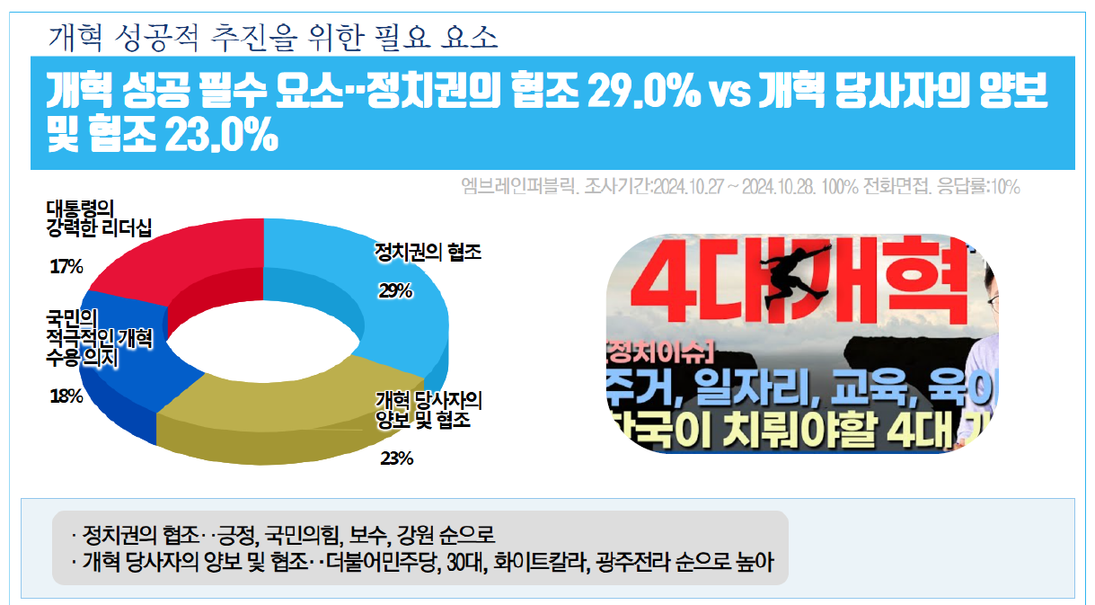 Á¶»ç±â°ü ¿¥ºê·¹ÀÎÆÛºí¸¯ÀÌ 10¿ù 27ÀÏ¿¡¼ 28ÀϱîÁö ÀÌÆ²°£ ½Ç½ÃÇÏ¿© 31ÀÏ ¹ßÇ¥ÇÑ ¡¸°³Çõ ¼º°øÀû ÃßÁøÀ» À§ÇÑ ÇÊ¿ä ¿ä¼Ò¡¹¸¦ ¹¯´Â Á¶»ç¿¡¼ ¡¸Á¤Ä¡±ÇÀÇ ÇùÁ¶¡¹ÀÌ 29%¸¦ ±â·ÏÇÏ¿© 2À§ ¡¸°³Çõ ´ç»çÀÚÀÇ ¾çº¸ ¹× ÇùÁ¶¡¹(23%)¿¡ 6%p Â÷ÀÌ·Î ¾Õ¼ ³ª°¡¸ç, µÚ¸¦ ÀÌ¾î ¡¸±¹¹ÎÀÇ Àû±ØÀûÀÎ °³Çõ ¼ö¿ë ÀÇÁö¡¹ÀÌ 18%, ¡¸´ëÅë·ÉÀÇ °·ÂÇÑ ¸®´õ½Ê¡¹ÀÌ 17%¸¦ ±â·ÏÇÏ¿´´Ù.
