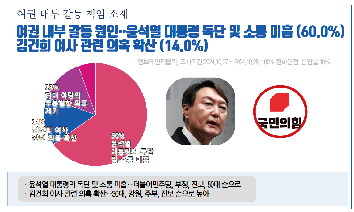 Á¶»ç±â°ü ¿¥ºê·¹ÀÎÆÛºí¸¯ÀÌ 10¿ù 27ÀÏ¿¡¼­ 28ÀϱîÁö ÀÌÆ²°£ ½Ç½ÃÇÏ¿© 1ÀÏ ¹ßÇ¥ÇÑ ¡¸¿©±Ç ³»ºÎ °¥µî Ã¥ÀÓ ¼ÒÀ硹¸¦ ¹¯´Â Á¶»ç¿¡¼­ ¡¸À±¼®¿­ ´ëÅë·ÉÀÇ µ¶´Ü ¹× ¼ÒÅë ¹ÌÈí¡¹ÀÌ 60%¸¦ ±â·ÏÇÏ¿© 2À§ ¡¸±è°ÇÈñ ¿©»ç °ü·Ã ÀÇȤ È®»ê¡¹(14%)¿¡ 46%p Â÷ÀÌ·Î ¾Õ¼­ ³ª°¡¸ç, µÚ¸¦ ÀÌ¾î ¡¸°Å´ë ¾ß´çÀÇ ¹«ºÐº°ÇÑ ÀÇȤ Á¦±â¡¹ÀÌ 13%, ¡¸Çѵ¿ÈÆ ¿©´ç ´ëÇ¥ÀÇ ¸®´õ½Ê ºÎÁ·¡¹ÀÌ 5%¸¦ ±â·ÏÇÏ¿´´Ù.