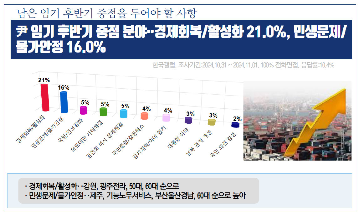Á¶»ç±â°ü Çѱ¹°¶·´Á¶»ç¿¬±¸¼Ò°¡ 10¿ù 31ÀÏ¿¡¼­ 1ÀϱîÁö ÀÌÆ²°£ ½Ç½ÃÇÏ¿© 3ÀÏ ¹ßÇ¥ÇÑ ¡¸³²Àº ÀÓ±â ÈĹݱâ ÁßÁ¡À» µÎ¾î¾ß ÇÒ »çÇס¹¸¦ ¹¯´Â Á¶»ç¿¡¼­ ¡¸°æÁ¦È¸º¹/Ȱ¼ºÈ­¡¹ÀÌ 21%¸¦ ±â·ÏÇÏ¿© 2À§ ¡¸¹Î»ý¹®Á¦/¹°°¡¾ÈÁ¤¡¹(16%)¿¡ 5%p Â÷ÀÌ·Î ¾Õ¼­ ³ª°¡¸ç, µÚ¸¦ ÀÌ¾î ¡¸±è°ÇÈñ ¿©»ç ¹®Á¦Çذ᡹ÀÌ 5%, ¡¸ÀÇ·á´ë¶õ »çÅÂÇØ°á¡¹ÀÌ 5%, ¡¸±¹¹æ/¾Èº¸°­È­¡¹ÀÌ 5%, ¡¸Á¤Ä¡°³Çõ/¿©¾ß ÇùÄ¡¡¹ÀÌ 4%, ¡¸±¹¹ÎÅëÇÕ/°¥µîÇØ¼Ò¡¹ÀÌ 4%, ¡¸³²ºÏ °ü°è °³¼±¡¹ÀÌ 3%, ¡¸´ëÅë·É ÇϾߡ¹ÀÌ 3%, ¡¸±¹¹Î ÀÇ°ß °æÃ»¡¹ÀÌ 2%¸¦ ±â·ÏÇÏ¿´´Ù.