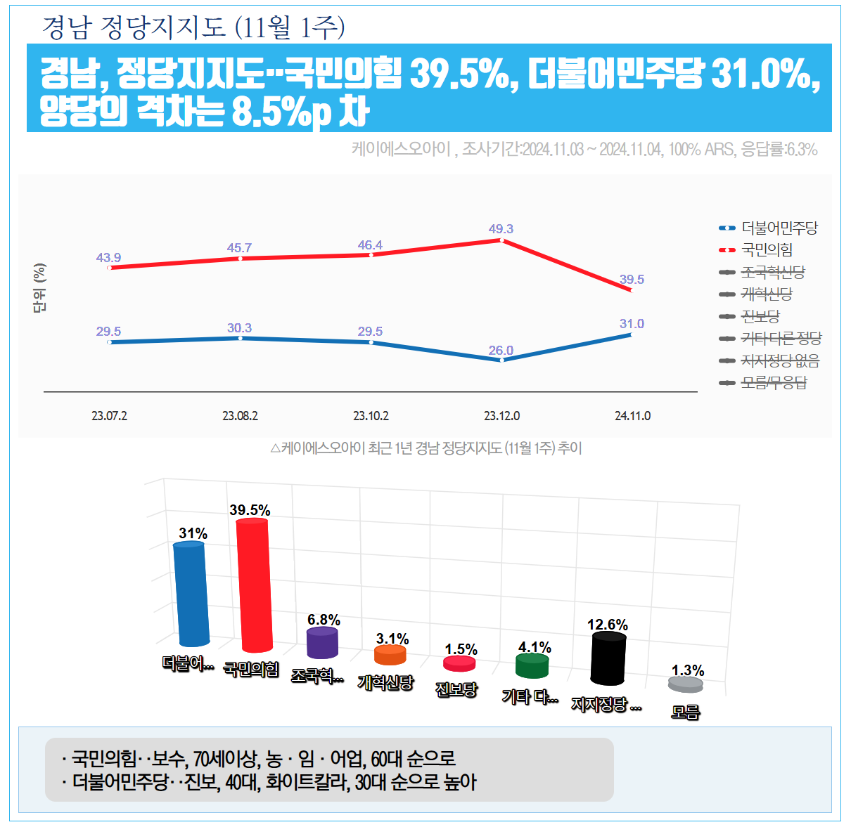Á¶»ç±â°ü ÄÉÀÌ¿¡½º¿À¾ÆÀÌ ÁÖ½Äȸ»ç(Çѱ¹»çȸ¿©·Ð¿¬±¸¼Ò)°¡ 11¿ù 3ÀÏ¿¡¼ 4ÀϱîÁö ÀÌÆ²°£ ½Ç½ÃÇÏ¿© 6ÀÏ ¹ßÇ¥ÇÑ ¡¸°æ³² Á¤´çÁöÁöµµ¡¹¸¦ ¹¯´Â Á¶»ç¿¡¼ ¡¸±¹¹ÎÀÇÈû¡¹ÀÌ 39.5%¸¦ ±â·ÏÇÏ¿© 2À§ ¡¸´õºÒ¾î¹ÎÁִ硹(31%)¿¡ 8.5%p Â÷ÀÌ·Î ¾Õ¼ ³ª°¡¸ç, µÚ¸¦ ÀÌ¾î ¡¸Á¶±¹Çõ½Å´ç¡¹ÀÌ 6.8%, ¡¸°³Çõ½Å´ç¡¹ÀÌ 3.1%, ¡¸Áøº¸´ç¡¹ÀÌ 1.5%¸¦ ±â·ÏÇÏ¿´´Ù.