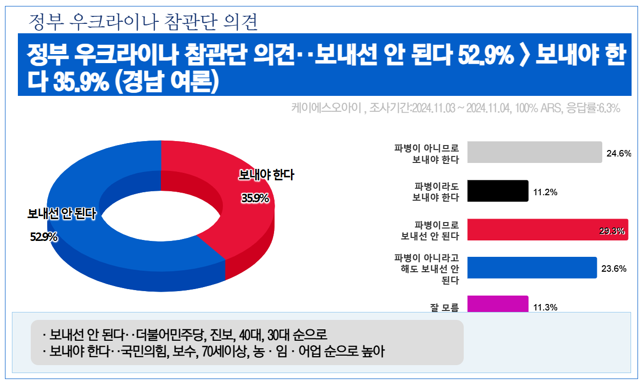 Á¤ºÎ ¿ìÅ©¶óÀ̳ª Âü°ü´Ü Àǰß(ÄÉÀÌ¿¡½º¿À¾ÆÀÌ ÁÖ½Äȸ»ç(Çѱ¹»çȸ¿©·Ð¿¬±¸¼Ò), ÀÀ´ä·ü 6.3%, 100% ARS Á¶»ç, 2024.11.06°øÇ¥)