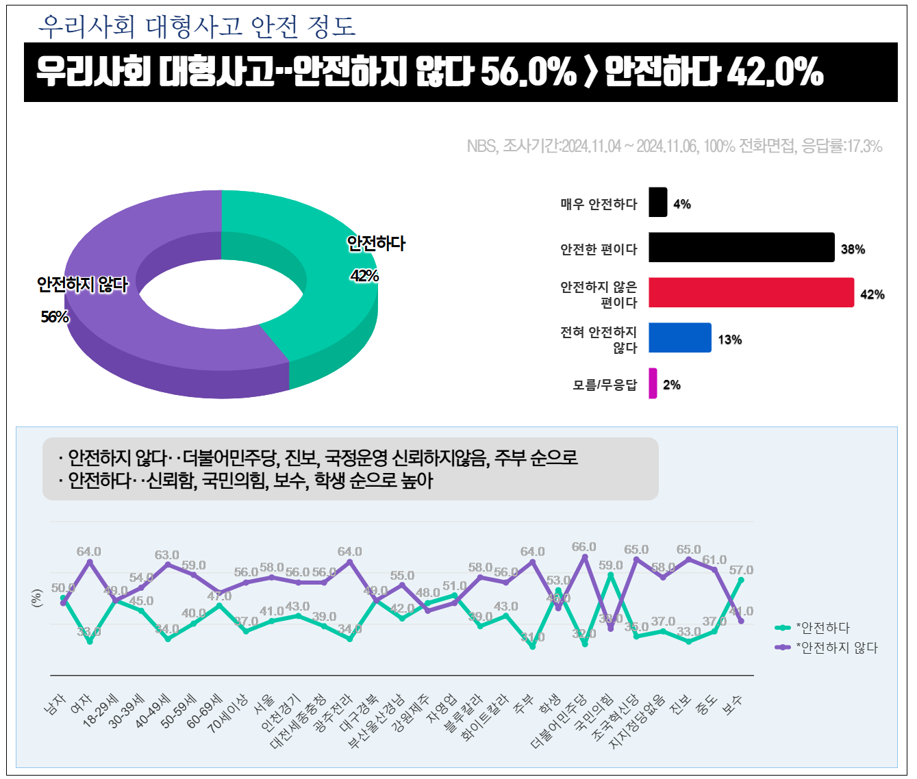 Á¶»ç±â°ü Çѱ¹¸®¼­Ä¡°¡ 11¿ù 4ÀÏ¿¡¼­ 6ÀϱîÁö »çÈê°£ ½Ç½ÃÇÏ¿© 7ÀÏ ¹ßÇ¥ÇÑ ¡¸¿ì¸®»çȸ ´ëÇü»ç°í ¾ÈÀü Á¤µµ¡¹Á¶»ç¿¡¼­ '¸Å¿ì ¾ÈÀüÇÏ´Ù'¿Í '¾ÈÀüÇÑ ÆíÀÌ´Ù'¸¦ ÇÕÇÑ ¡¸¾ÈÀüÇÏ´Ù¡¹´Â 42%À̸ç, '¾ÈÀüÇÏÁö ¾ÊÀº ÆíÀÌ´Ù'¿Í 'ÀüÇô ¾ÈÀüÇÏÁö ¾Ê´Ù'¸¦ ÇÕÇÑ ¡¸¾ÈÀüÇÏÁö ¾Ê´Ù¡¹´Â 55%·Î ³ª¿Ô´Ù.