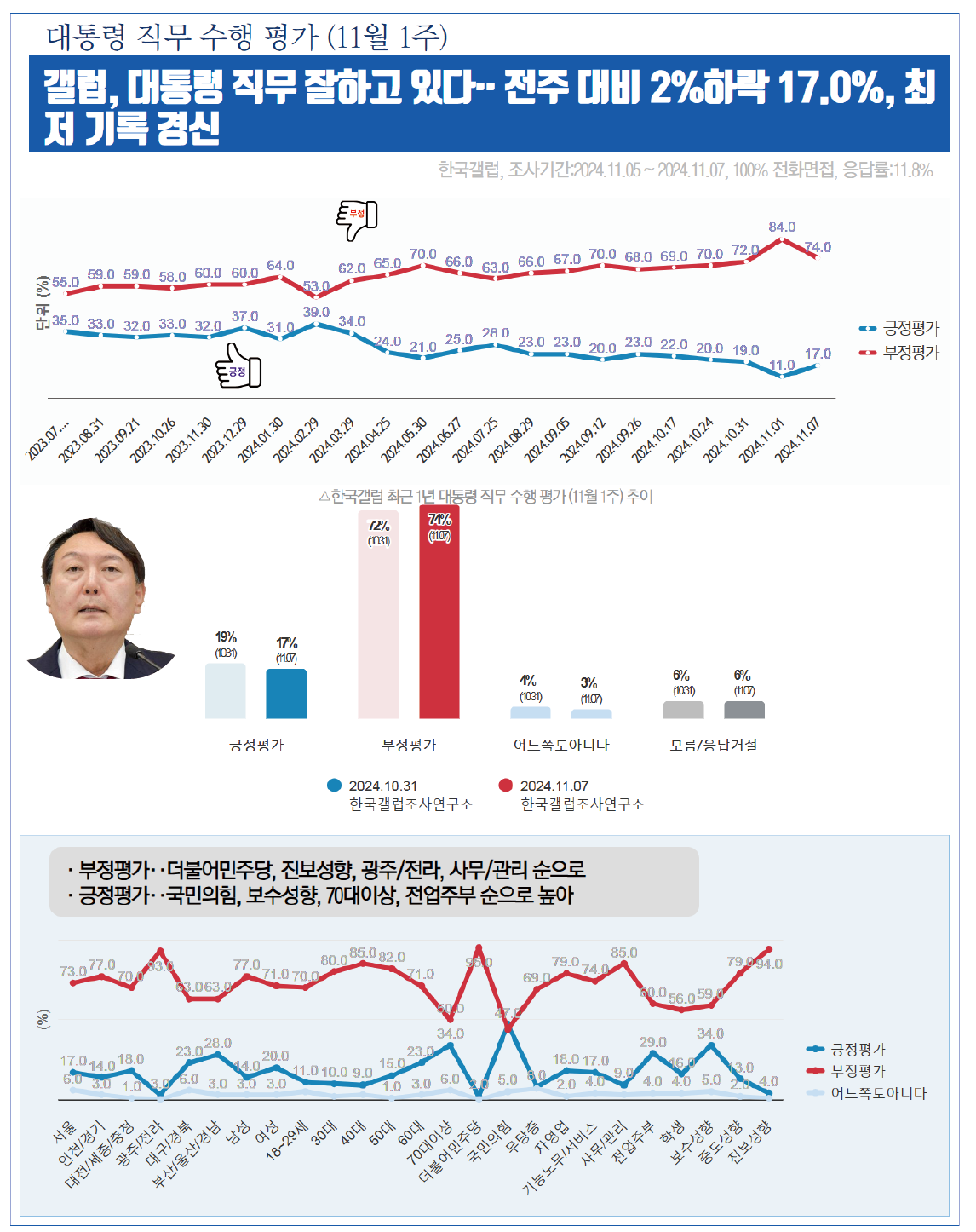 À±¼®¿­ ´ëÅë·ÉÀÇ ±¹Á¤¿î¿µ ÁöÁöµµ°¡ ÃëÀÓ ÀÌ·¡ ÃÖÀúÄ¡ÀÎ 17%¸¦ ±â·ÏÇß´Ù. ¹Ý´ë·Î 'À߸øÇϰí ÀÖ´Ù'´Â ºÎÁ¤Æò°¡´Â 74%·Î ÃÖ´ëÄ¡¸¦ ±â·ÏÇß´Ù.