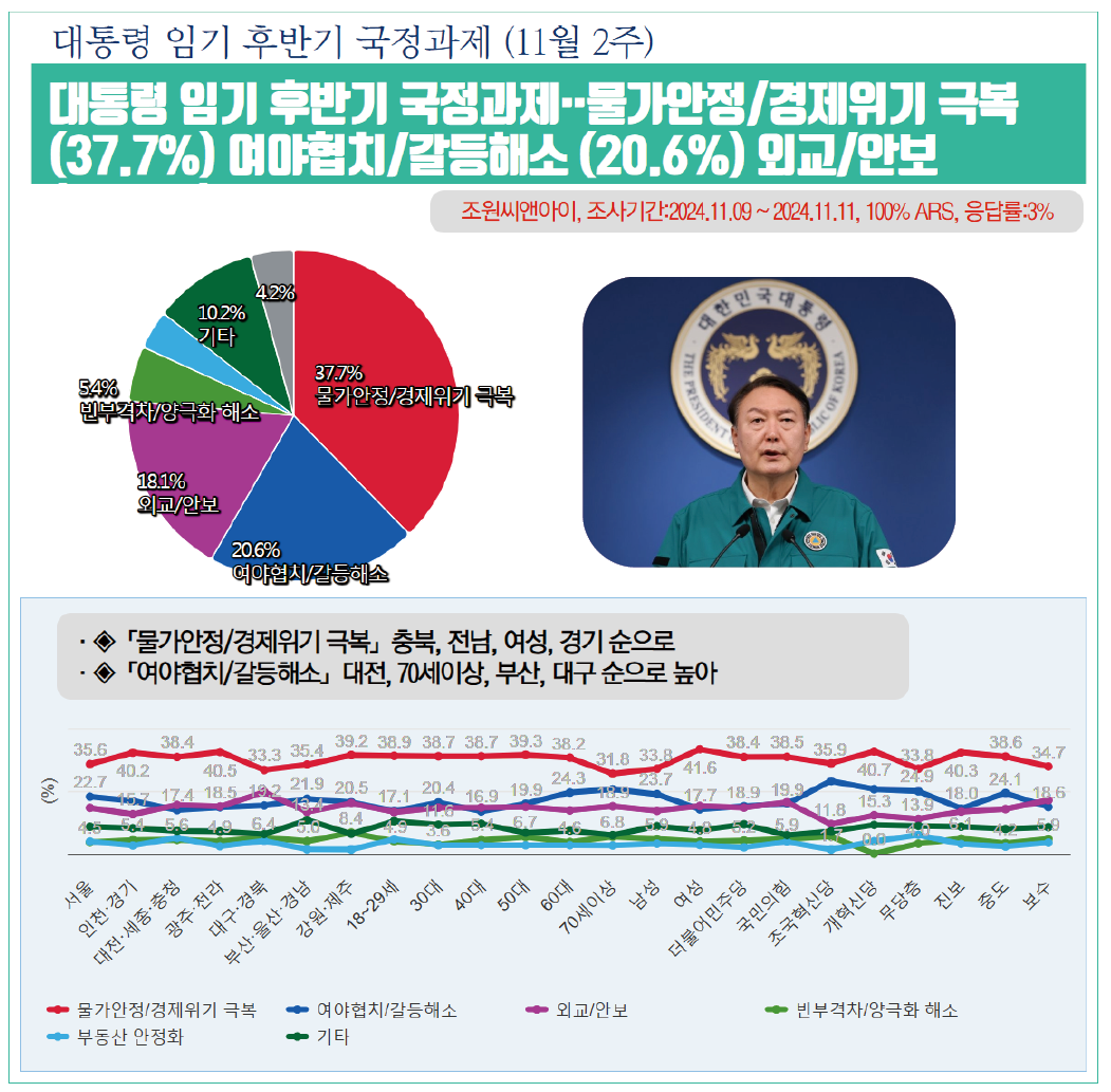 Á¶»ç±â°ü Á¶¿ø¾¾¾Ø¾ÆÀ̰¡ 11¿ù 9ÀÏ¿¡¼­ 11ÀϱîÁö »çÈê°£ ½Ç½ÃÇÏ¿© 13ÀÏ ¹ßÇ¥ÇÑ ¡¸´ëÅë·É ÀÓ±â ÈĹݱ⠱¹Á¤°úÁ¦¡¹¸¦ ¹¯´Â Á¶»ç¿¡¼­ ¡¸¹°°¡¾ÈÁ¤/°æÁ¦À§±â ±Øº¹¡¹ÀÌ 37.7%¸¦ ±â·ÏÇÏ¿© 2À§ ¡¸¿©¾ßÇùÄ¡/°¥µîÇØ¼Ò¡¹(20.6%)¿¡ 17.1%p Â÷ÀÌ·Î ¾Õ¼­ ³ª°¡¸ç, µÚ¸¦ ÀÌ¾î ¡¸¿Ü±³/¾Èº¸¡¹ÀÌ 18.1%, ¡¸ºóºÎ°ÝÂ÷/¾ç±ØÈ­ ÇØ¼Ò¡¹ÀÌ 5.4%, ¡¸ºÎµ¿»ê ¾ÈÁ¤È­¡¹ÀÌ 3.8%¸¦ ±â·ÏÇÏ¿´´Ù.
