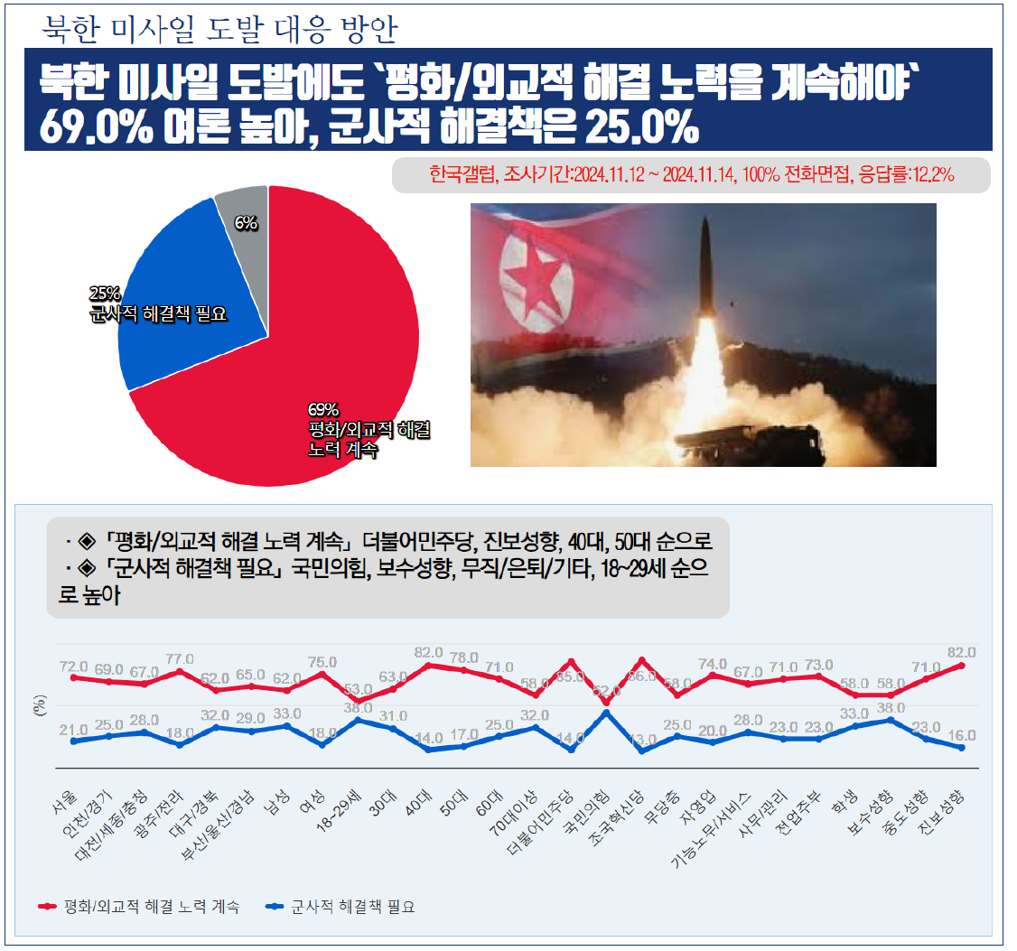 Á¶»ç±â°ü Çѱ¹°¶·´Á¶»ç¿¬±¸¼Ò°¡ 11¿ù 12ÀÏ¿¡¼­ 14ÀϱîÁö »çÈê°£ ½Ç½ÃÇÏ¿© 15ÀÏ ¹ßÇ¥ÇÑ ¡¸ºÏÇÑ ¹Ì»çÀÏ µµ¹ß ´ëÀÀ ¹æ¾È¡¹¸¦ ¹¯´Â Á¶»ç¿¡¼­ ¡¸ÆòÈ­/¿Ü±³Àû ÇØ°á ³ë·Â °è¼Ó¡¹ÀÌ 69%¸¦ ±â·ÏÇÏ¿© 2À§ ¡¸±º»çÀû ÇØ°áÃ¥ Çʿ䡹(25%)¿¡ 44%p Â÷ÀÌ·Î ¾Õ¼­ ³ª°¡´Â °ÍÀ¸·Î ³ªÅ¸³µ´Ù.