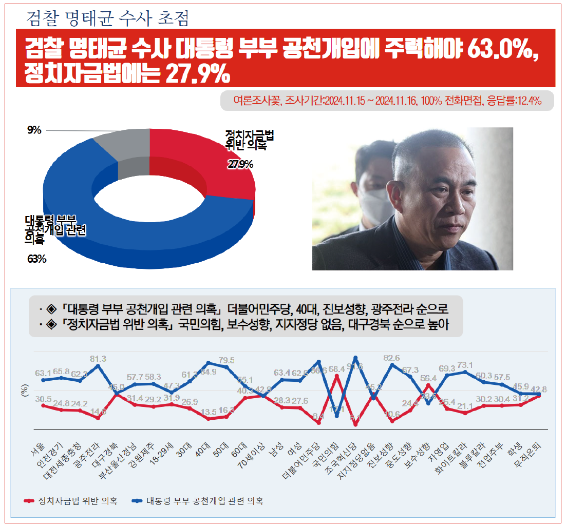 Á¶»ç±â°ü ¿©·ÐÁ¶»ç²ÉÀÌ 11¿ù 15ÀÏ¿¡¼­ 16ÀϱîÁö ÀÌÆ²°£ ½Ç½ÃÇÏ¿© 18ÀÏ ¹ßÇ¥ÇÑ ¡¸°ËÂû ¸íÅÂ±Õ ¼ö»ç ÃÊÁ¡¡¹¸¦ ¹¯´Â Á¶»ç¿¡¼­ ¡¸´ëÅë·É ºÎºÎ °øÃµ°³ÀÔ °ü·Ã ÀÇȤ¡¹ÀÌ 63%¸¦ ±â·ÏÇÏ¿© 2À§ ¡¸Á¤Ä¡Àڱݹý À§¹Ý ÀÇȤ¡¹(27.9%)¿¡ 35.1%p Â÷ÀÌ·Î ¾Õ¼­ ³ª°¡´Â °ÍÀ¸·Î ³ªÅ¸³µ´Ù.