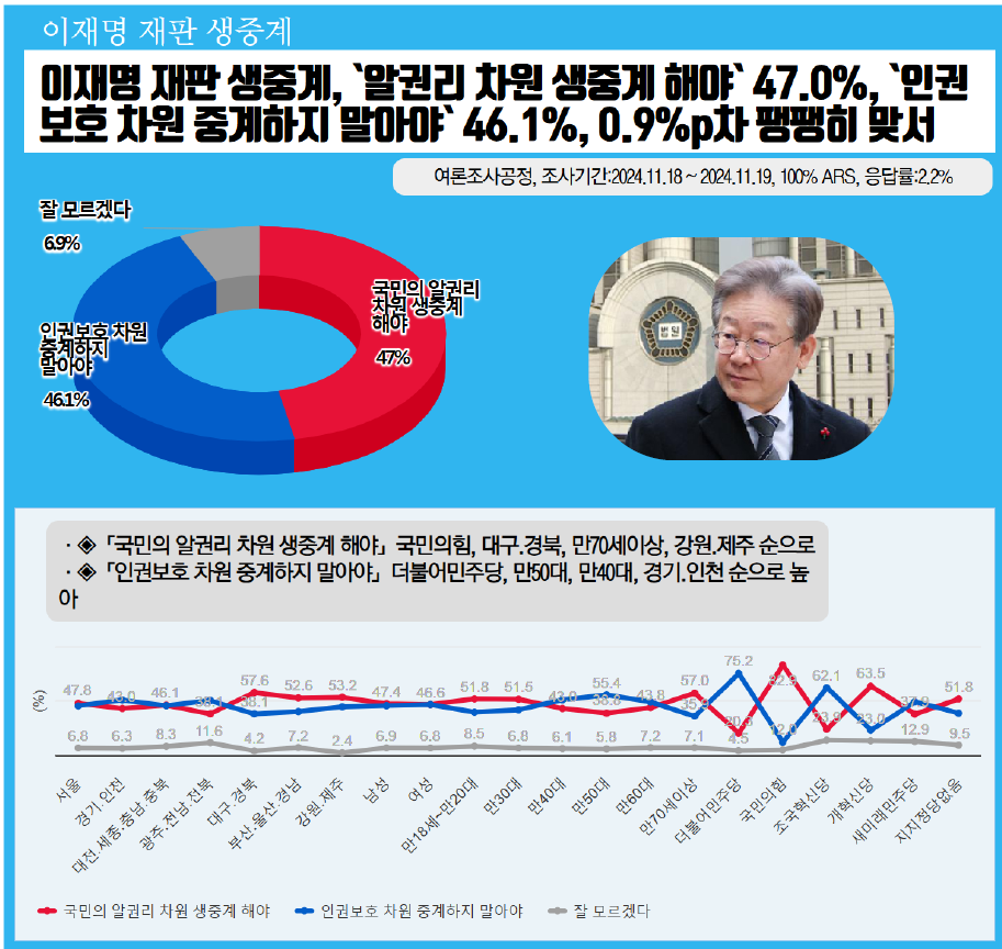 ÀÌÀç¸í ÀçÆÇ »ýÁß°è, '¾Ë±Ç¸® Â÷¿ø »ýÁß°è ÇØ¾ß' 47.0%, 'ÀαǺ¸È£ Â÷¿ø Áß°èÇÏÁö ¸»¾Æ¾ß' 46.1%, 0.9%pÂ÷ ÆØÆØÈ÷ ¸Â¼