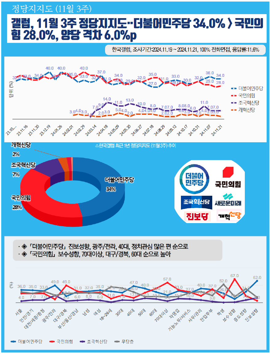 °¶·´, 11¿ù 3ÁÖ Á¤´çÁöÁöµµ¡¥´õºÒ¾î¹ÎÁÖ´ç 34.0% > ±¹¹ÎÀÇÈû 28.0%, ¾ç´ç °ÝÂ÷ 6.0%p