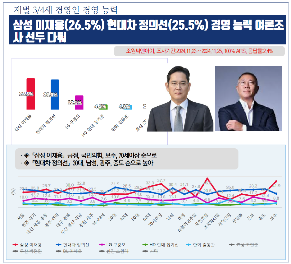 ¡¸Àç¹ú 3/4¼¼ °æ¿µÀÎ °æ¿µ ´É·Â¡¹À» ¹¯´Â Á¶»ç¿¡¼ '»ï¼º ÀÌÀç¿ë'»çÀåÀÌ 26.5%¸¦ ¾ò¾î 25.5%¸¦ ¾òÀº 'Çö´ëÂ÷ Á¤ÀǼ±'»çÀå°ú 1.0%Æ÷ÀÎÆ® Â÷ÀÌ·Î 1,2À§¸¦ ±â·ÏÇß´Ù.
