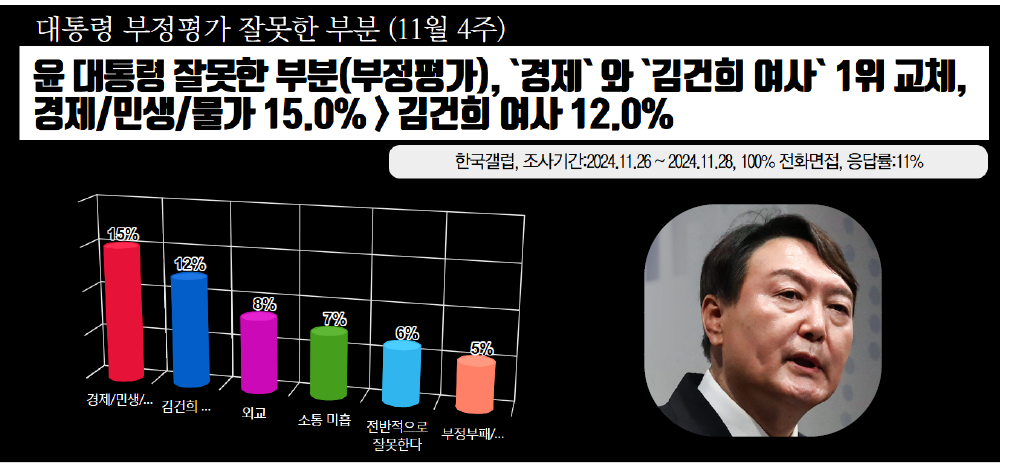 Á¶»ç±â°ü Çѱ¹°¶·´Á¶»ç¿¬±¸¼Ò°¡ 11¿ù 26ÀÏ¿¡¼ 28ÀϱîÁö »çÈê°£ ½Ç½ÃÇÏ¿© 29ÀÏ ¹ßÇ¥ÇÑ ¡¸´ëÅë·É ºÎÁ¤Æò°¡ À߸øÇÑ ºÎºÐ¡¹¸¦ ¹¯´Â Á¶»ç¿¡¼ ¡¸°æÁ¦/¹Î»ý/¹°°¡¡¹ÀÌ 15%¸¦ ±â·ÏÇÏ¿© 2À§ ¡¸±è°ÇÈñ ¿©»ç ¹®Á¦¡¹(12%)¿¡ 3%p Â÷ÀÌ·Î ¾Õ¼ ³ª°¡¸ç, µÚ¸¦ ÀÌ¾î ¡¸¿Ü±³¡¹ 8%, ¡¸¼ÒÅë ¹ÌÈí¡¹ 7%, ¡¸Àü¹ÝÀûÀ¸·Î À߸øÇÑ´Ù¡¹ 6%, ¡¸ºÎÁ¤ºÎÆÐ/ºñ¸®¡¹ 5%, ¡¸°æÇ衤ÀÚÁú ºÎÁ·/¹«´ÉÇÔ¡¹ 4%, ¡¸µ¶´ÜÀû/ÀϹæÀû¡¹ 4%, ¡¸°øÁ¤ÇÏÁö ¾ÊÀ½¡¹ 3%, ¡¸¼¹Î Á¤Ã¥/º¹Áö¡¹ 2%, ¡¸Á÷¹« ŵµ¡¹ 2%, ¡¸°ÅºÎ±Ç Çà»ç¡¹ 2%, ¡¸ÅëÇÕ¡¤ÇùÄ¡ ºÎÁ·¡¹ 2%, ¡¸ÀÇ´ë Á¤¿ø È®´ë¡¹ 2%¸¦ ±â·ÏÇÏ¿´´Ù.
