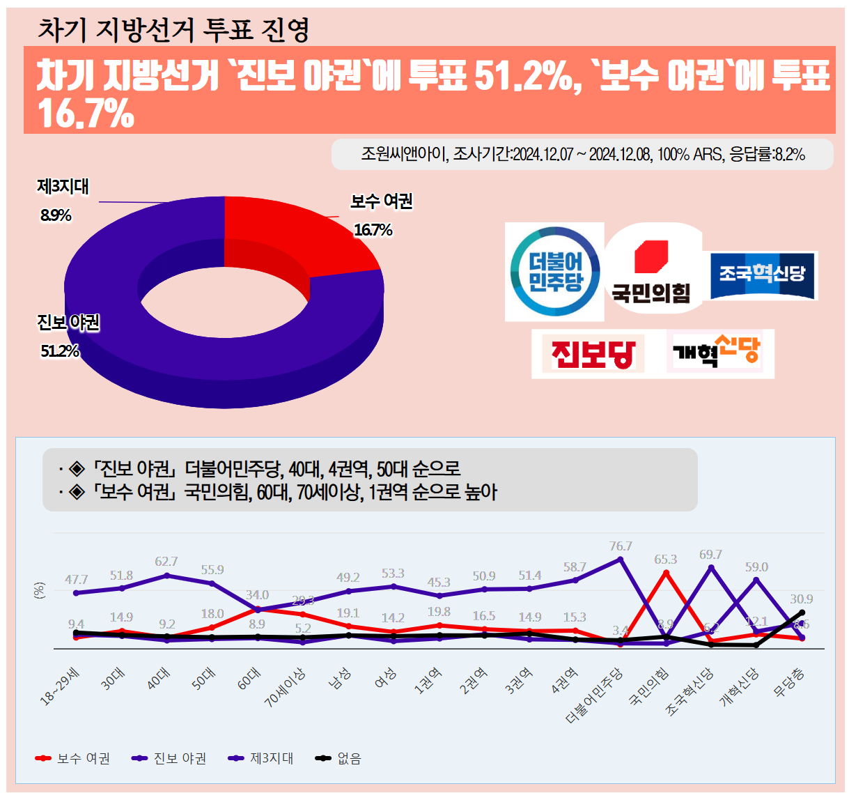 ¡¸Áøº¸ ¾ß±Ç¡¹´Â(Àº) "´õºÒ¾î¹ÎÁÖ´ç"ÁöÁöÃþ(76.7%) "40´ë"¿¬·ÉÃþ(62.7%) "4±Ç¿ª"Áö¿ª(58.7%) "50´ë"¿¬·ÉÃþ(55.9%)¿¡¼ ³ô¾Ò°í, ¡¸º¸¼ö ¿©±Ç¡¹´Â(Àº) "±¹¹ÎÀÇÈû"ÁöÁöÃþ(65.3%) "60´ë"¿¬·ÉÃþ(34%) "70¼¼ÀÌ»ó"¿¬·ÉÃþ(29.3%) "1±Ç¿ª"Áö¿ª(19.8%)¿¡¼, ¡¸Á¦3Áö´ë¡¹´Â(Àº) "2±Ç¿ª"Áö¿ª(12.1%) "18~29¼¼"¿¬·ÉÃþ(11.9%) "³²¼º"(11.2%) "30´ë"¿¬·ÉÃþ(10.8%)¿¡¼ »ó´ëÀûÀ¸·Î ³ôÀº °æÀï·ÂÀ» º¸¿´´Ù.