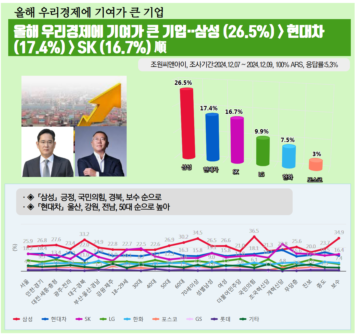 Á¶»ç±â°ü Á¶¿ø¾¾¾Ø¾ÆÀ̰¡ 11ÀÏ ¹ßÇ¥ÇÑ ¡¸¿ÃÇØ ¿ì¸®°æÁ¦¿¡ ±â¿©°¡ Å« ±â¾÷¡¹¸¦ ¹¯´Â Á¶»ç¿¡¼­ ¡¸»ï¼º¡¹ÀÌ 26.5%¸¦ ±â·ÏÇÏ¿© 2À§ ¡¸Çö´ëÂ÷¡¹(17.4%)¿¡ 9.1%p Â÷ÀÌ·Î ¾Õ¼­ ³ª°¡¸ç, µÚ¸¦ ÀÌ¾î ¡¸SK¡¹16.7%, ¡¸LG¡¹9.9%, ¡¸ÇÑÈ­¡¹7.5%, ¡¸Æ÷½ºÄÚ¡¹3%, ¡¸GS¡¹2%, ¡¸·Ôµ¥¡¹1%¸¦ ±â·ÏÇÏ¿´´Ù.