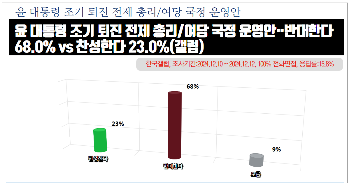 ¡¸À± ´ëÅë·É Á¶±â ÅðÁøÀ» ÀüÁ¦ÇÑ ÃѸ®-¿©´ç ±¹Á¤ ¿î¿µ ¹æ¾È¡¹¿¡ ´ëÇØ '¹Ý´ëÇÑ´Ù'´Â ÀÀ´äÀÌ 68%, 'Âù¼ºÇÑ´Ù'´Â ÀÀ´äÀÌ 23%·Î ³ª¿Ô´Ù.