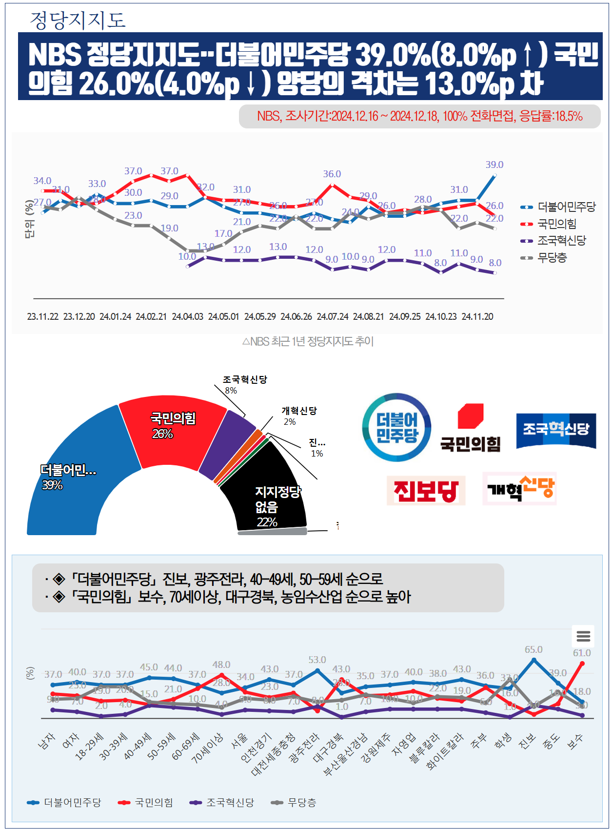 [NBS] Á¤´çÁöÁöµµ¡¥´õºÒ¾î¹ÎÁÖ´ç 39.0%(8.0%p¡è) ±¹¹ÎÀÇÈû 26.0%(4.0%p¡é) ¾ç´çÀÇ °ÝÂ÷´Â 13.0%p Â÷