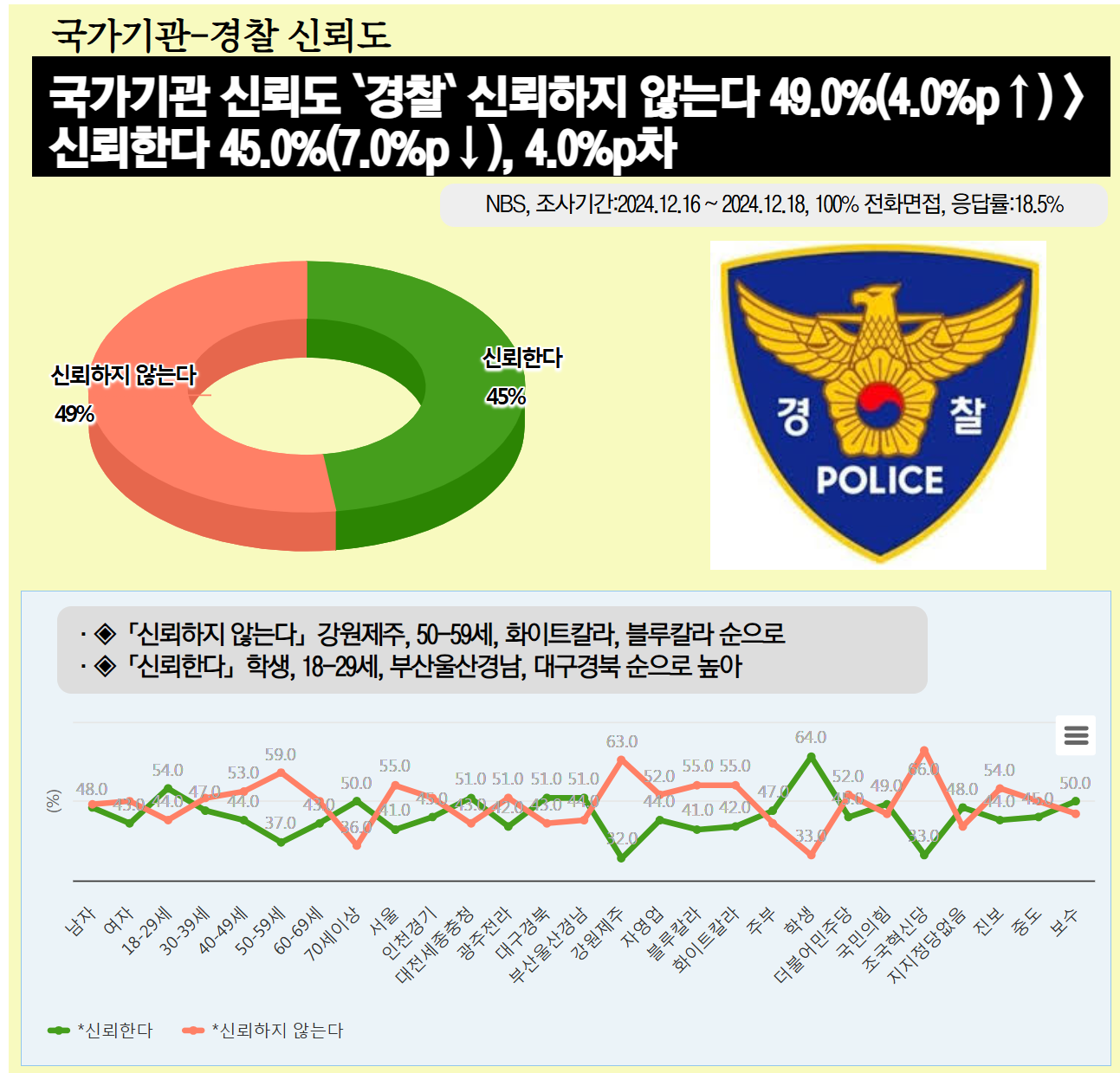 ¡¸±¹°¡±â°ü-°æÂû ½Å·Úµµ¡¹Á¶»ç¿¡¼ '½Å·ÚÇÏÁö ¾Ê´Â´Ù'°¡ 49.0%, ½Å·ÚÇÑ´Ù°¡ 45.0%·Î ³ª¿Ô´Ù.