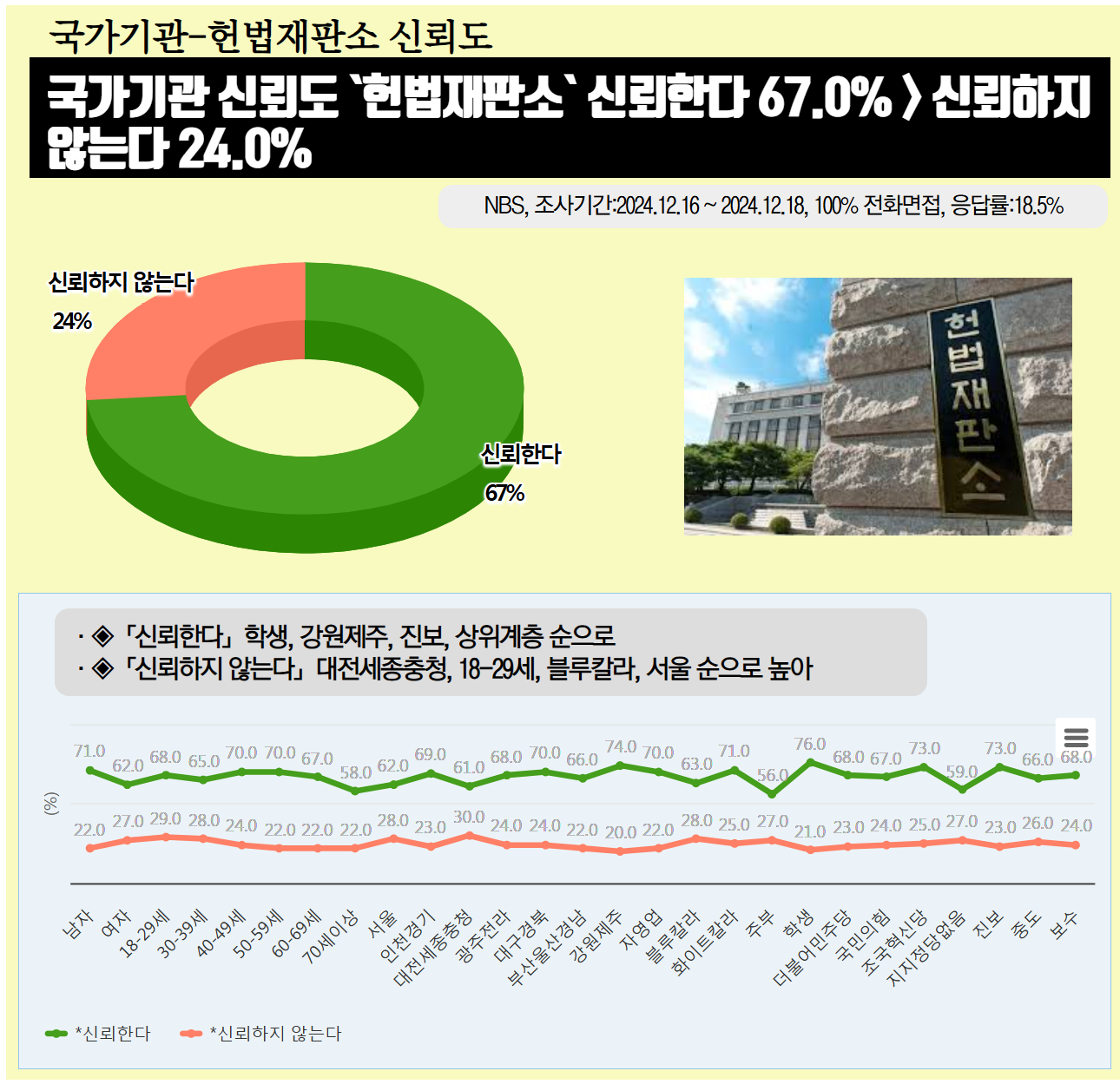 Á¶»ç±â°ü ¿¥ºê·¹ÀÎÆÛºí¸¯ÀÌ 12¿ù 16ÀÏ¿¡¼ 18ÀϱîÁö »çÈê°£ ½Ç½ÃÇÏ¿© 19ÀÏ ¹ßÇ¥ÇÑ ¡¸±¹°¡±â°ü-Çå¹ýÀçÆÇ¼Ò ½Å·Úµµ¡¹Á¶»ç¿¡¼ '¸Å¿ì ½Å·ÚÇÑ´Ù'¿Í '½Å·ÚÇÏ´Â ÆíÀÌ´Ù'¸¦ ÇÕÇÑ ¡¸½Å·ÚÇÑ´Ù¡¹´Â 67%À̸ç, '½Å·ÚÇÏÁö ¾Ê´Â ÆíÀÌ´Ù'¿Í 'ÀüÇô ½Å·ÚÇÏÁö ¾Ê´Â´Ù'¸¦ ÇÕÇÑ ¡¸½Å·ÚÇÏÁö ¾Ê´Â´Ù¡¹´Â 25%·Î ³ª¿Ô´Ù.