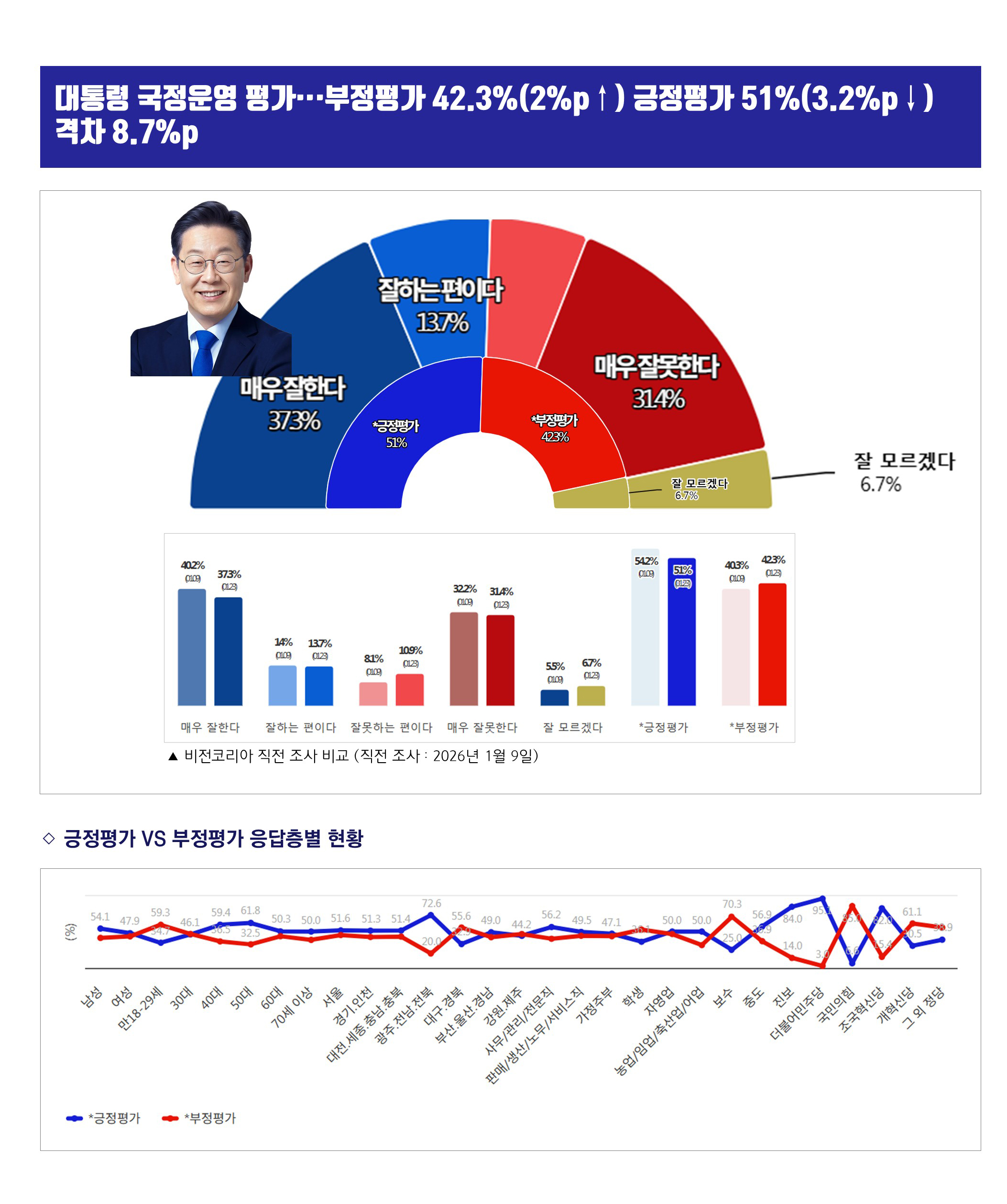 ´ëÅë·É ±¹Á¤¿î¿µ Æò°¡¡¤¡¤¡¤±àÁ¤Æò°¡ 51%(3.2%p¡é) > ºÎÁ¤Æò°¡ 42.3%(2%p¡è) °ÝÂ÷ 8.7%p