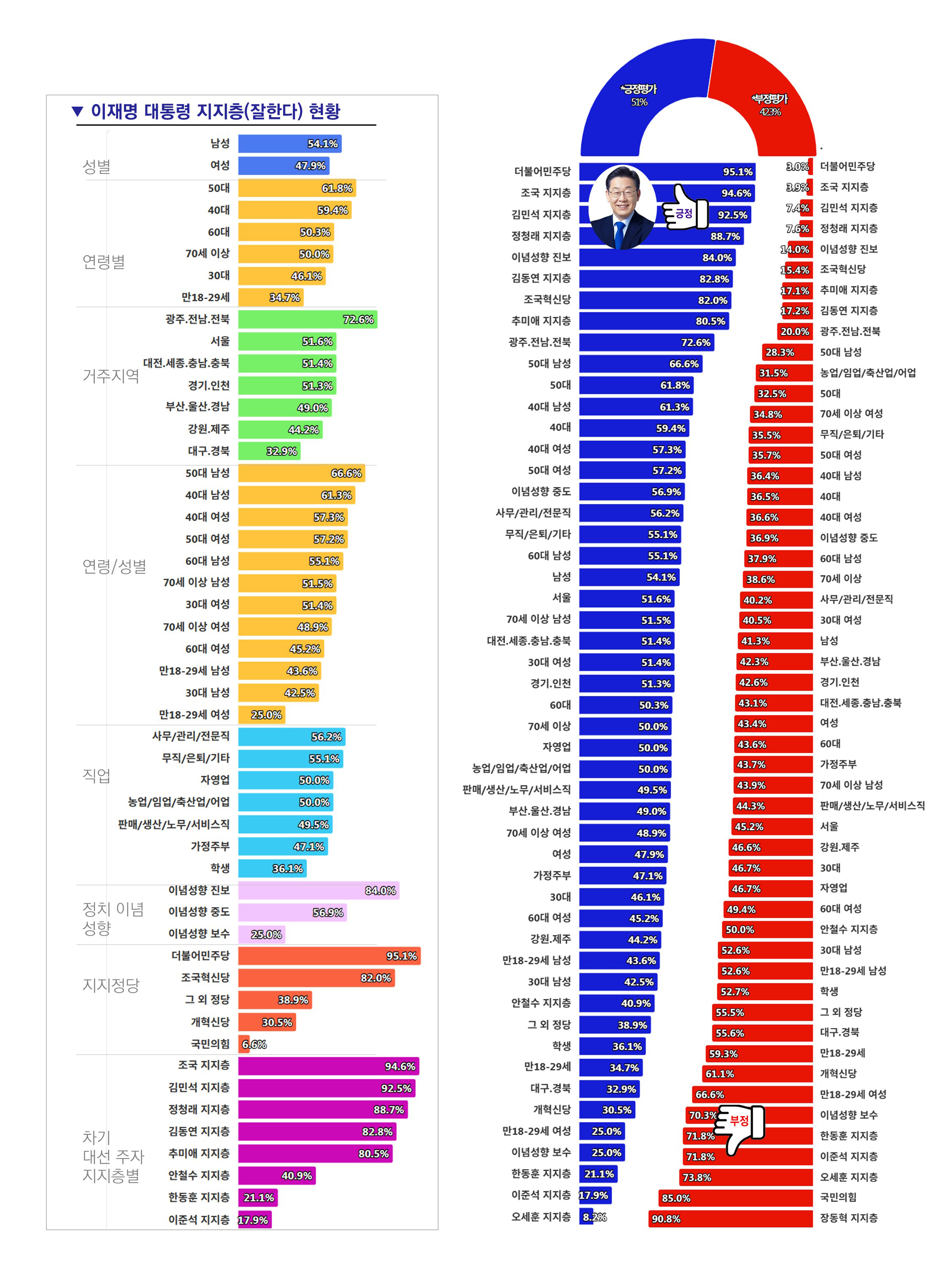 ¡¸±¹Á¤¿î¿µ-±àÁ¤Æò°¡¡¹´Â ´õºÒ¾î¹ÎÁÖ´ç ÁöÁöÃþ(95.1%) Áøº¸ ÀÀ´äÃþ(84%) Á¶±¹Çõ½Å´ç ÁöÁöÃþ(82%) ±¤ÁÖ.Àü³².ÀüºÏ (72.6%) 50´ë ¿¬·ÉÃþ(61.8%)¿¡¼ ³ô¾Ò°í, ¡¸±¹Á¤¿î¿µ-ºÎÁ¤Æò°¡¡¹´Â ±¹¹ÎÀÇÈû ÁöÁöÃþ(85%) º¸¼ö ÀÀ´äÃþ(70.3%) °³Çõ½Å´ç ÁöÁöÃþ(61.1%) ¸¸18-29¼¼ ¿¬·ÉÃþ(59.3%) ´ë±¸.°æºÏ (55.6%)¿¡¼ »ó´ëÀûÀ¸·Î ³ô°Ô ³ªÅ¸³µ´Ù.
