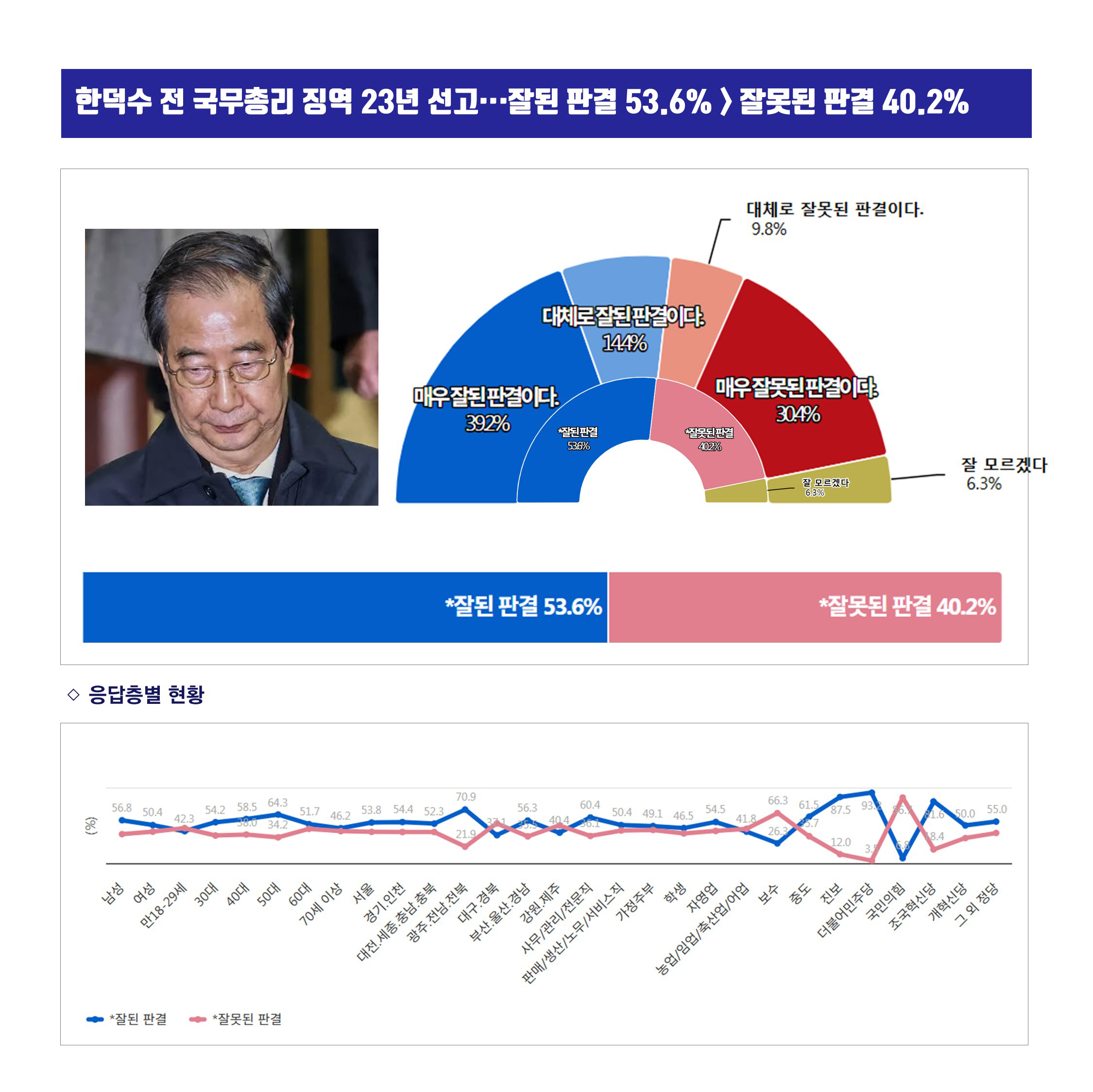 Á¶»ç±â°ü ºñÀüÄÚ¸®¾Æ°¡ 1¿ù 23ÀÏ ÇϷ絿¾È ½Ç½ÃÇÏ¿© 26ÀÏ ¹ßÇ¥ÇÑ ¡¸ÇÑ´ö¼ö Àü ±¹¹«ÃѸ® ¡¿ª 23³â ¼±°í Æò°¡¡¹Á¶»ç¿¡¼ '¸Å¿ì ÀßµÈ ÆÇ°áÀÌ´Ù.'¿Í '´ëü·Î ÀßµÈ ÆÇ°áÀÌ´Ù.'¸¦ ÇÕÇÑ ¡¸ÀßµÈ ÆÇ°á¡¹´Â 53.6%À̸ç, '´ëü·Î À߸øµÈ ÆÇ°áÀÌ´Ù.'¿Í '¸Å¿ì À߸øµÈ ÆÇ°áÀÌ´Ù.'¸¦ ÇÕÇÑ ¡¸À߸øµÈ ÆÇ°á¡¹´Â 40.2%·Î ³ª¿Ô´Ù.